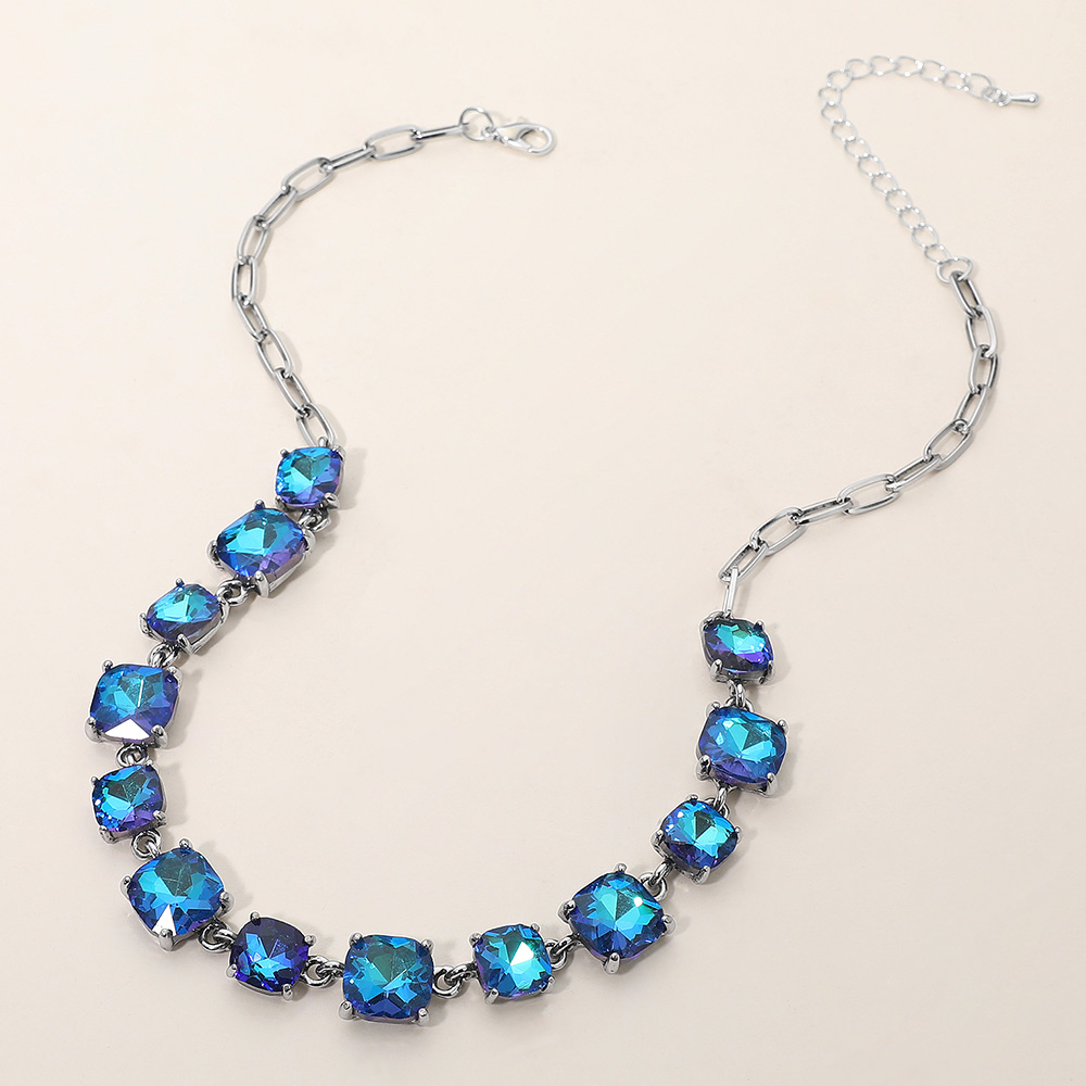 Details • Necklace Size : 16" + 2.75" L • Decor Size : 0.5" L • Elevate your style with this stunning square cut gemstone statement necklace. Featuring shimmering faceted stones linked in a classic design, it offers a chic adjustable fit. Perfect for evening wear, weddings, parties, or adding a sophisticated sparkle to your everyday look. • Lead and Nickel Compliant