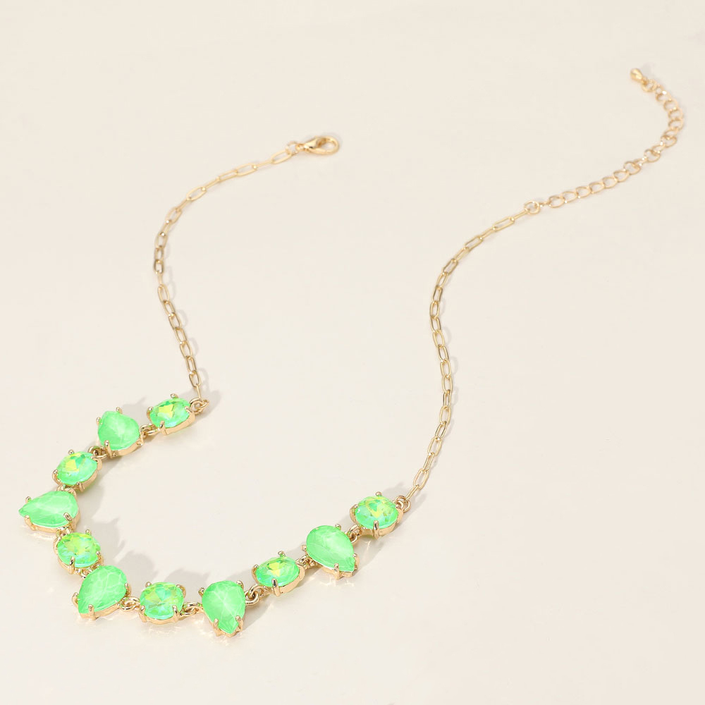 Details • Necklace Size : 16.5" + 3" L • Decor Size : 0.6" L • Turn heads with this striking green gemstone necklace, designed to bring bold color and modern elegance to your wardrobe. A perfect piece to elevate evening outfits or add flair to your everyday style. • Lead and Nickel Compliant