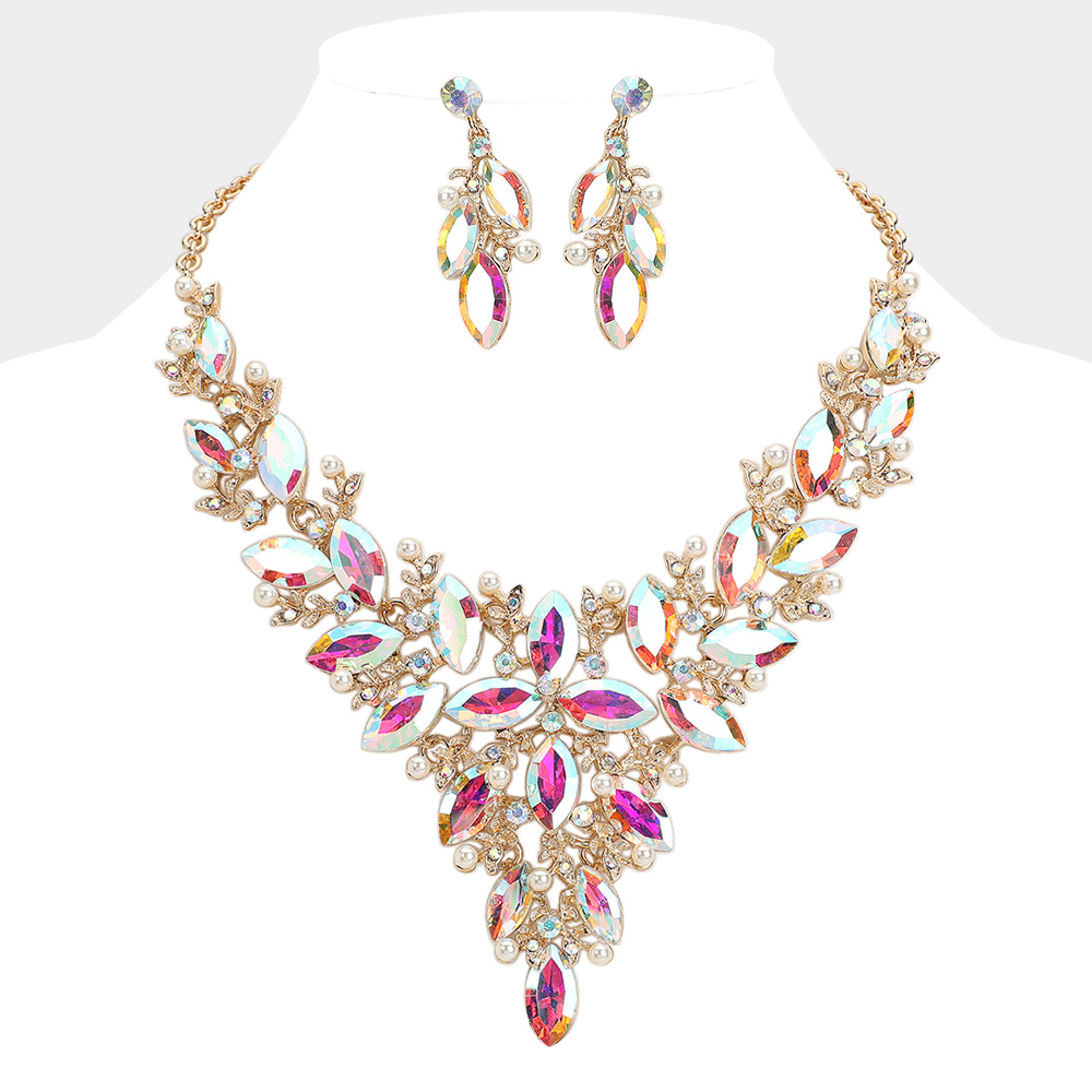 Marquise Glass Stone Cluster Pearl Embellished Vine Evening Necklace