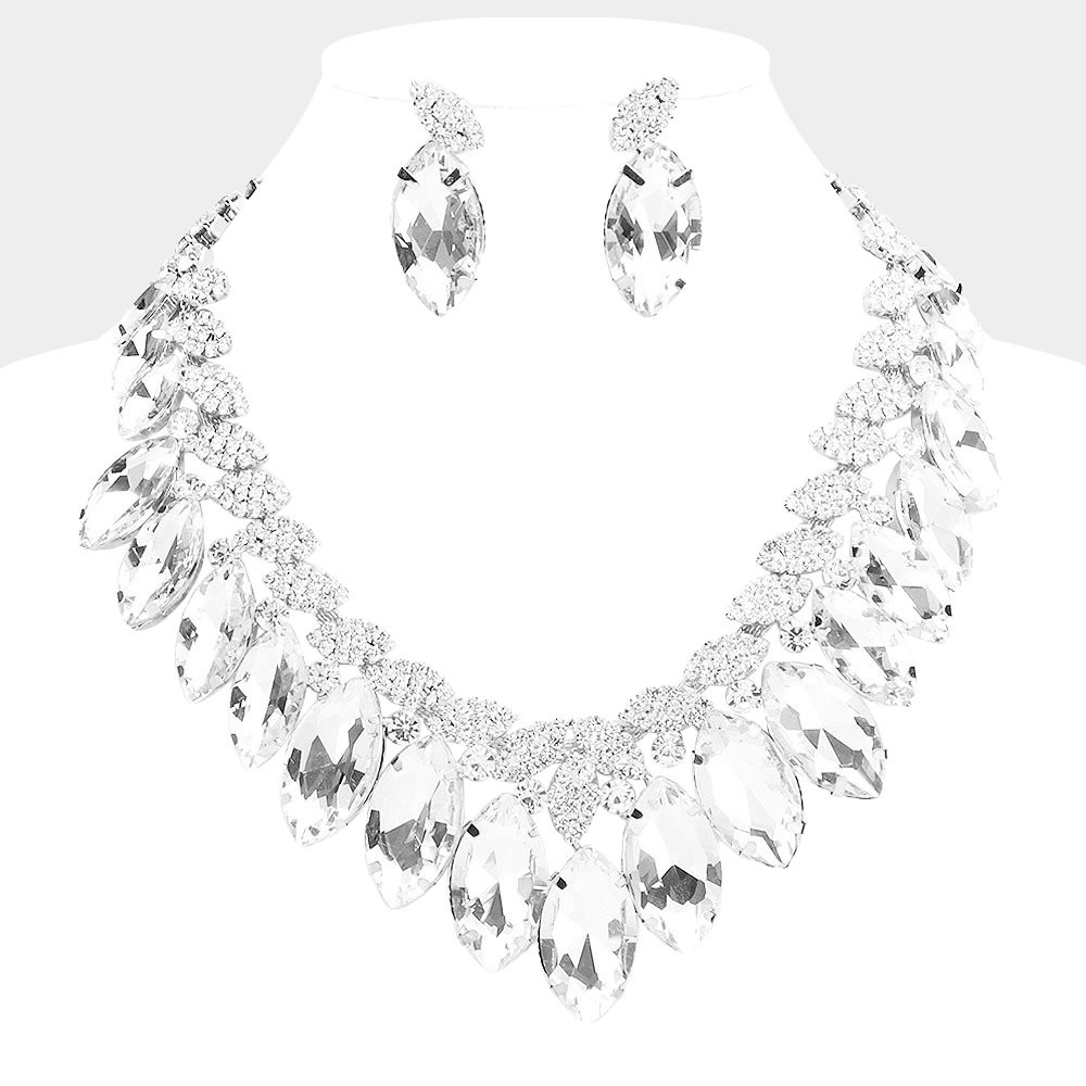 Oval Stone Accented V Shaped Rhinestone Necklace Clip on Earring Set