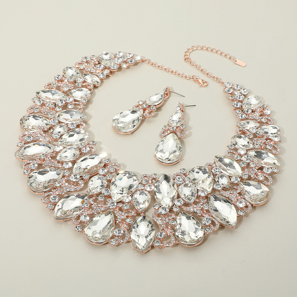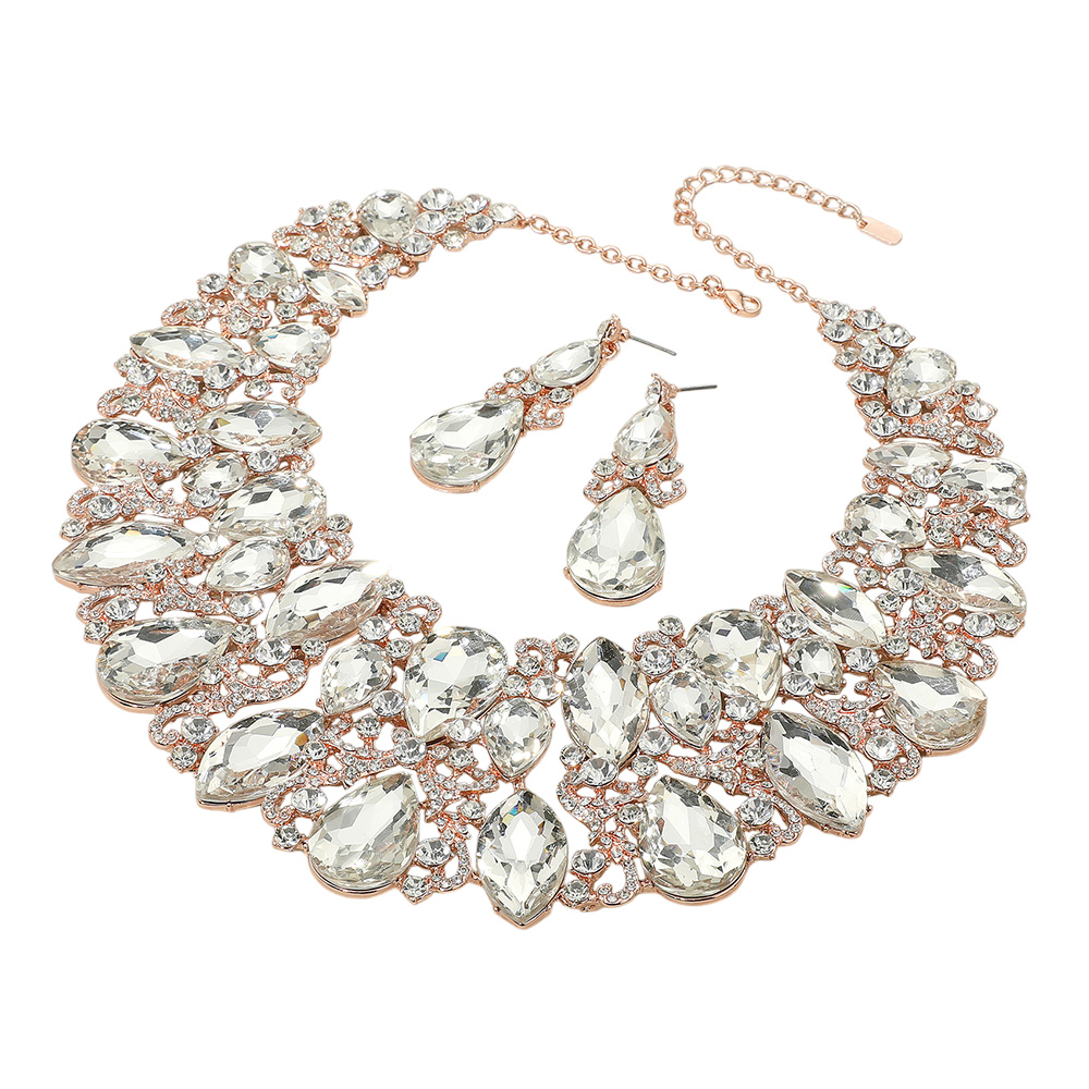 • This striking jewelry set features a statement necklace adorned with large, faceted gem accents, paired with matching drop earrings. Designed to turn heads, it’s perfect for adding glamorous sparkle to evening wear or special occasion outfits.
