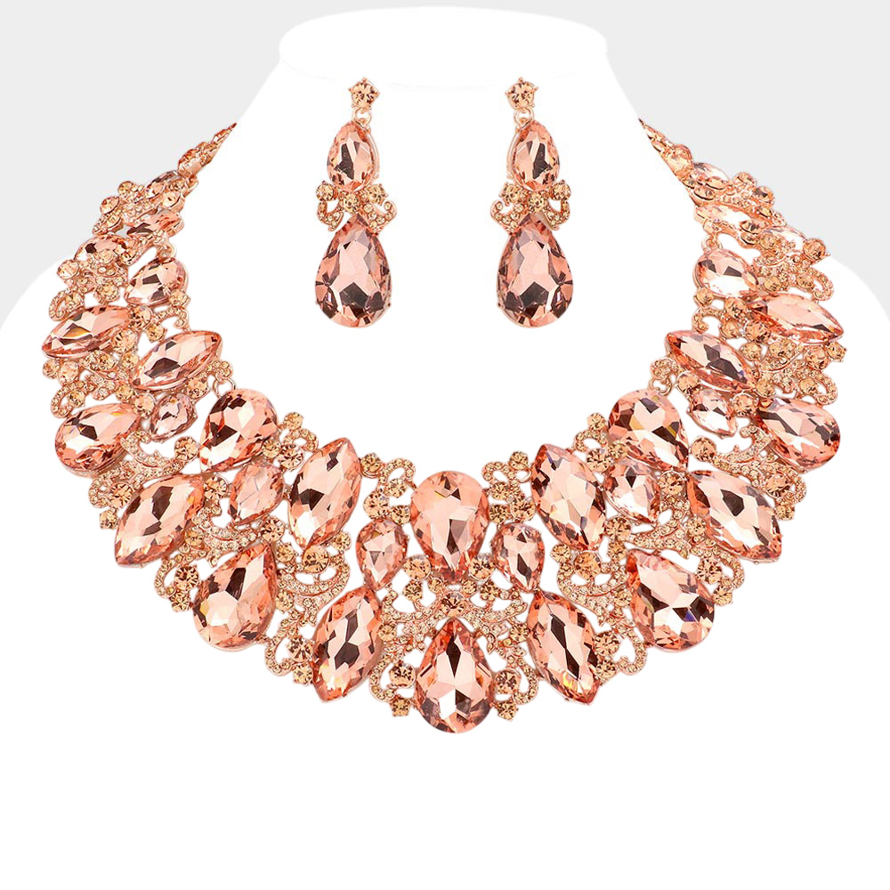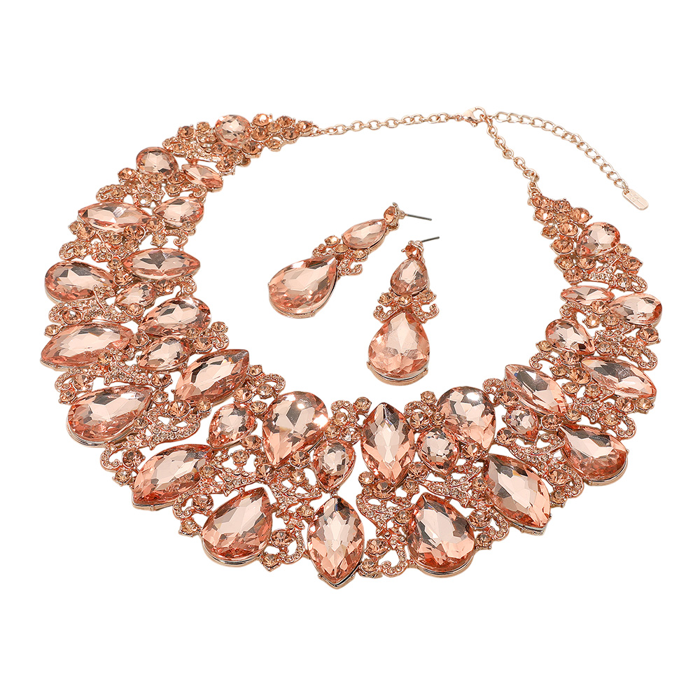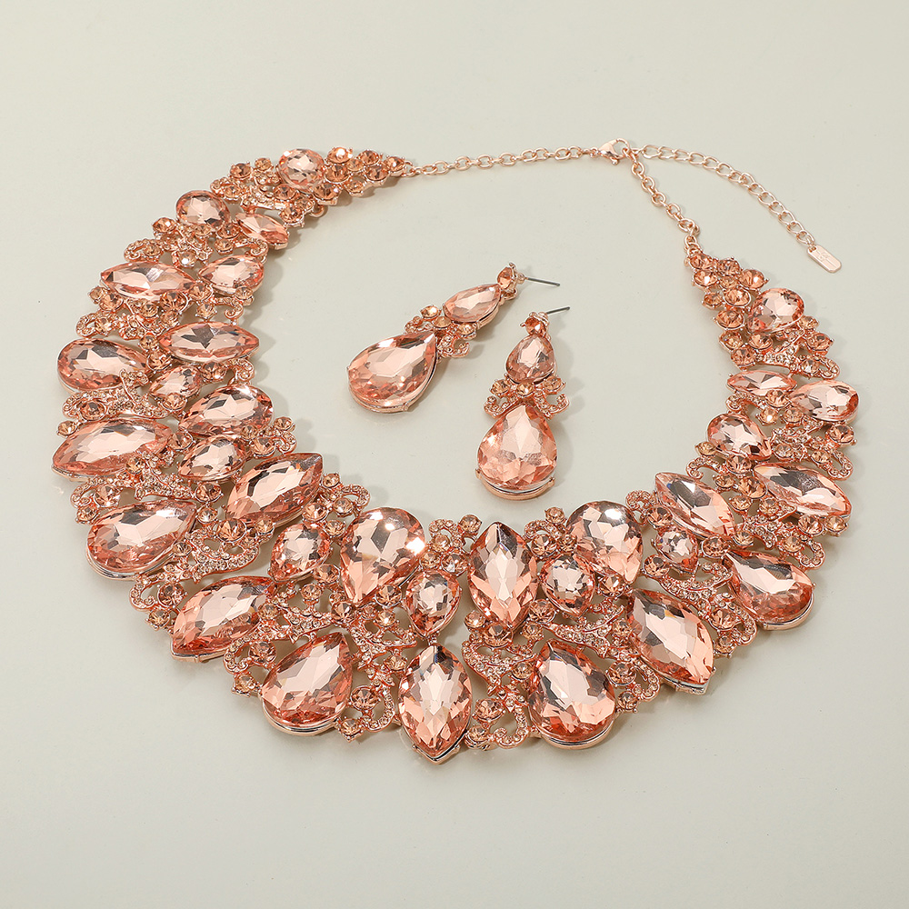 • This striking jewelry set features a statement necklace adorned with large, faceted gem accents, paired with matching drop earrings. Designed to turn heads, it’s perfect for adding glamorous sparkle to evening wear or special occasion outfits.