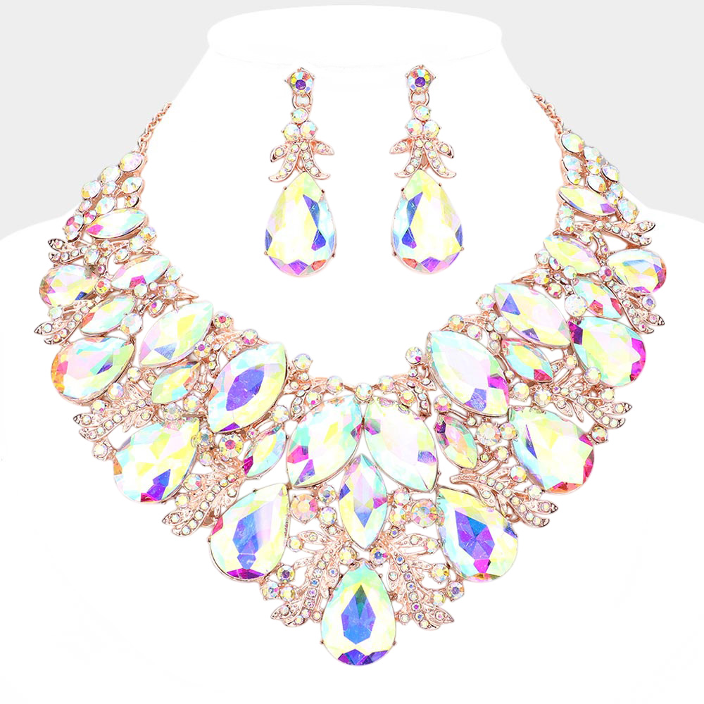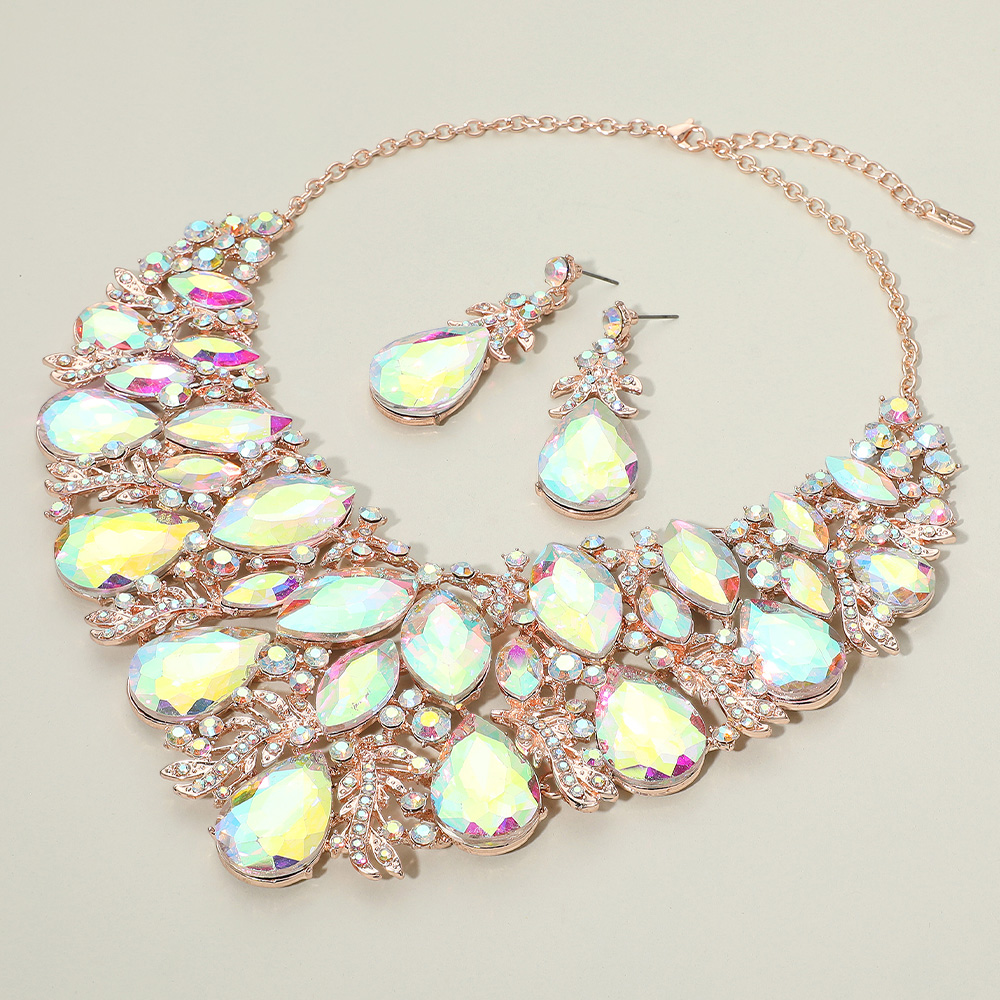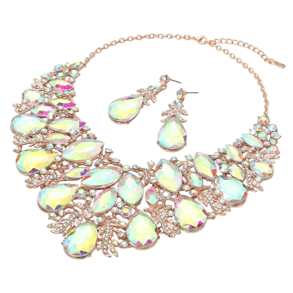 Details • Necklace Size : 18.5" + 2.5" L • Decor Size : 3" L • Earring Size : 2.25" L • This dazzling jewelry set features a statement necklace adorned with iridescent teardrop gems and crystal accents, paired with matching drop earrings. Perfect for special occasions, it adds radiant sparkle and glamour to any evening or formal outfit.