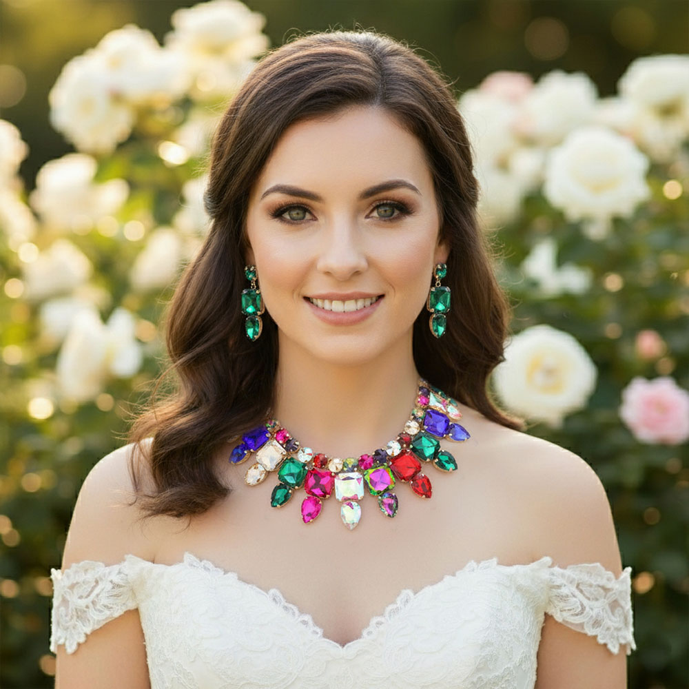 • Stunning statement jewelry set featuring a dramatic necklace and matching earrings adorned with large gemstones. Perfect for special occasions, parties, or evening events, adding glamour and sophistication to any outfit. A show-stopping accessory for an elegant, confident look.