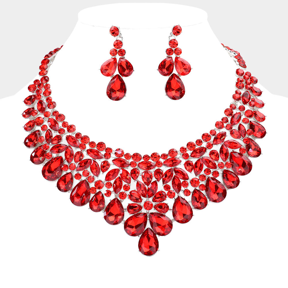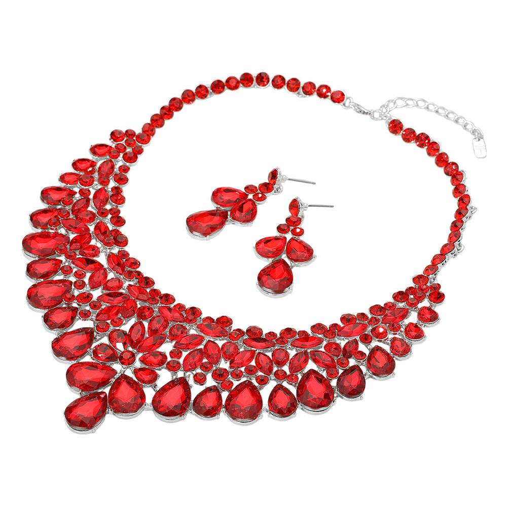 Details • Necklace Size : 16" + 2.5" L • Decor Size : 2.5" L • Earring Size : 2" L • Elegant statement necklace and matching earrings featuring shimmering teardrop gemstones. A striking set perfect for weddings, galas, or special occasions that demand bold sophistication.