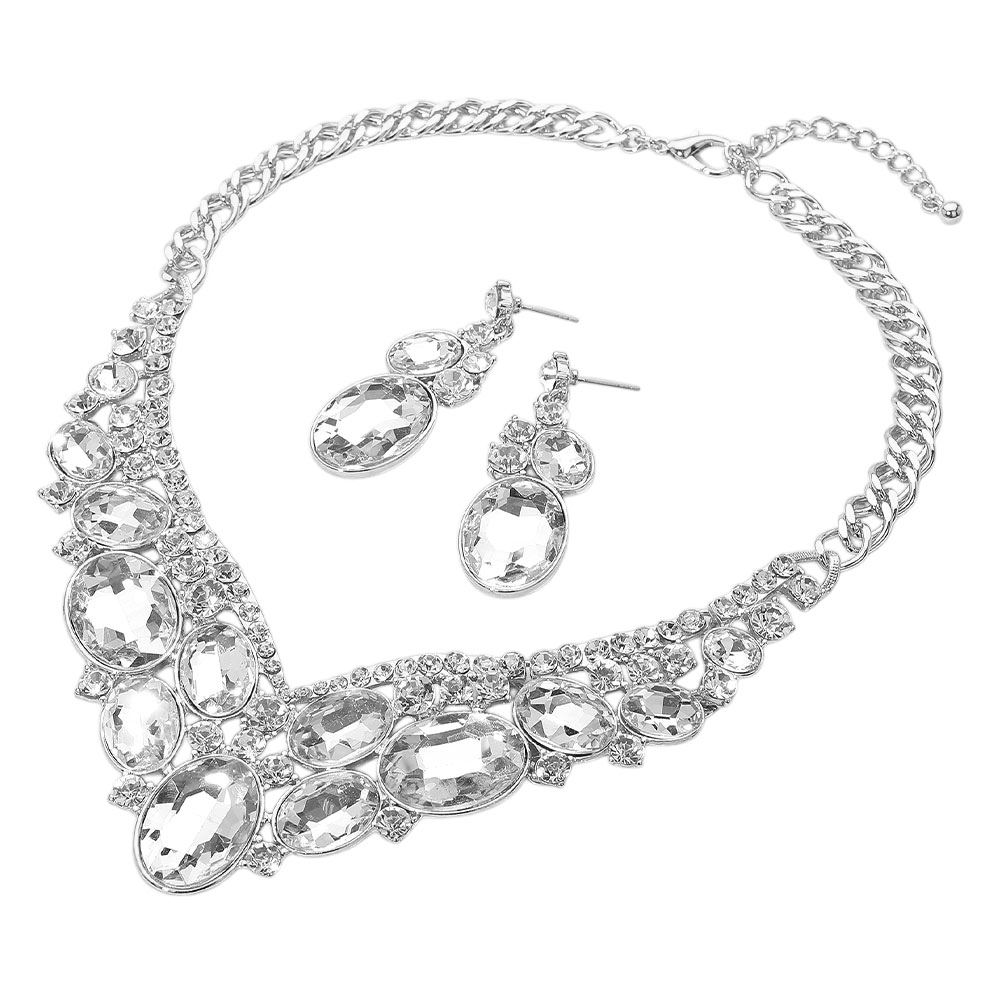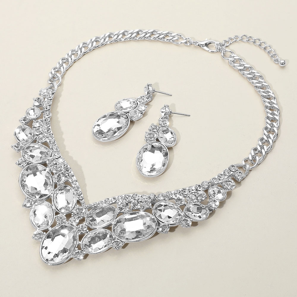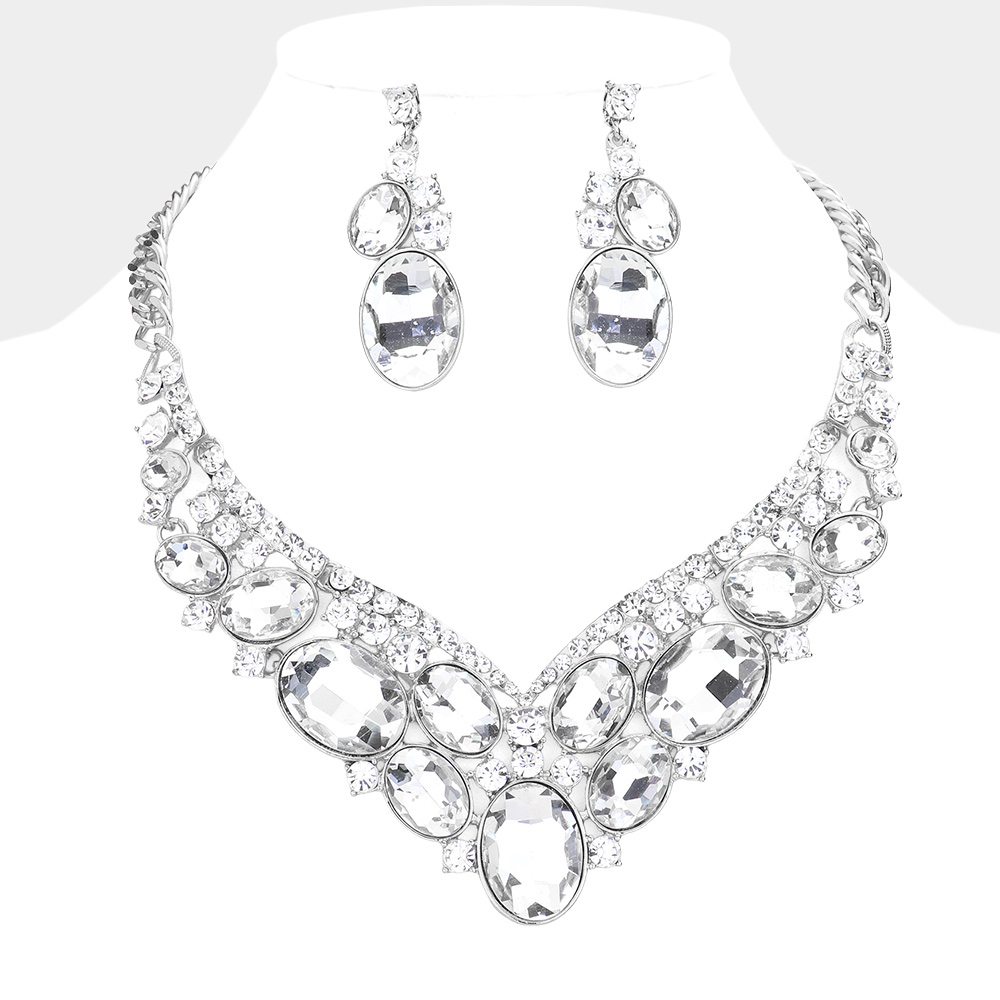 Details • Necklace Size : 16" + 3" L • Decor Size : 1.75" L • Earrings Size : 2.25" L • Bold statement necklace with large faceted crystal accents and coordinating drop earrings. Ideal for weddings, evening events, and special occasions. Adds sparkle and luxury to any formal outfit.