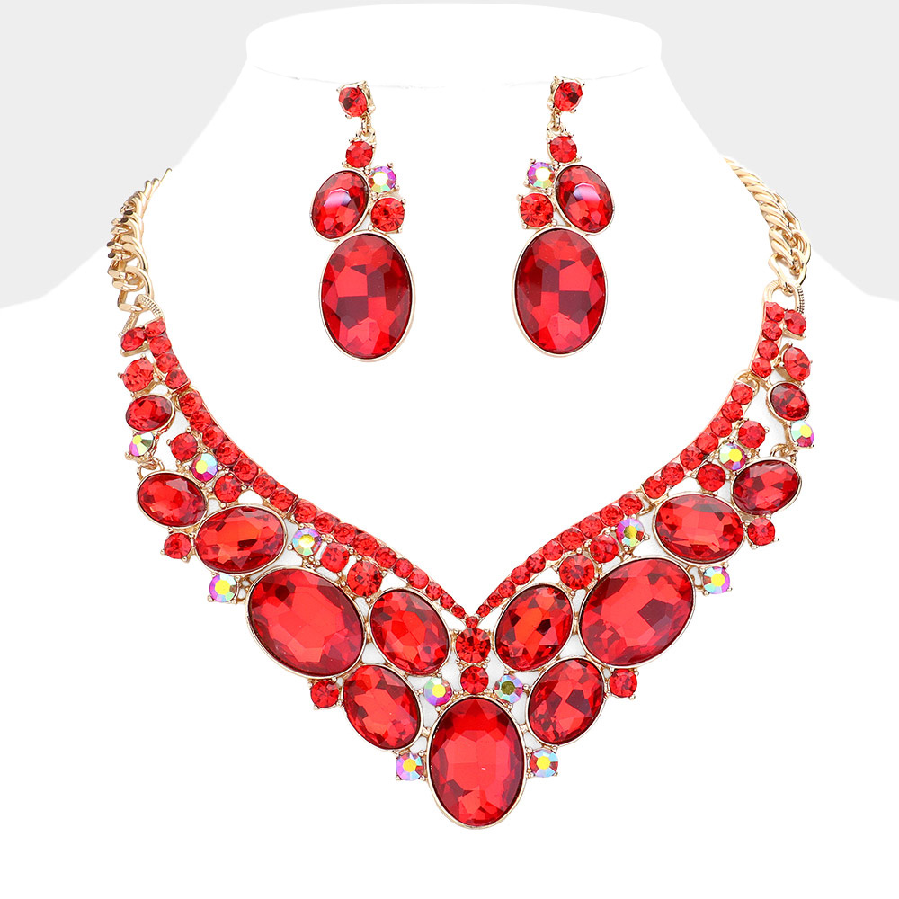 Details • Necklace Size : 16" + 3" L • Decor Size : 1.75" L • Earrings Size : 2.25" L • Bold statement necklace with large faceted crystal accents and coordinating drop earrings. Ideal for weddings, evening events, and special occasions. Adds sparkle and luxury to any formal outfit.