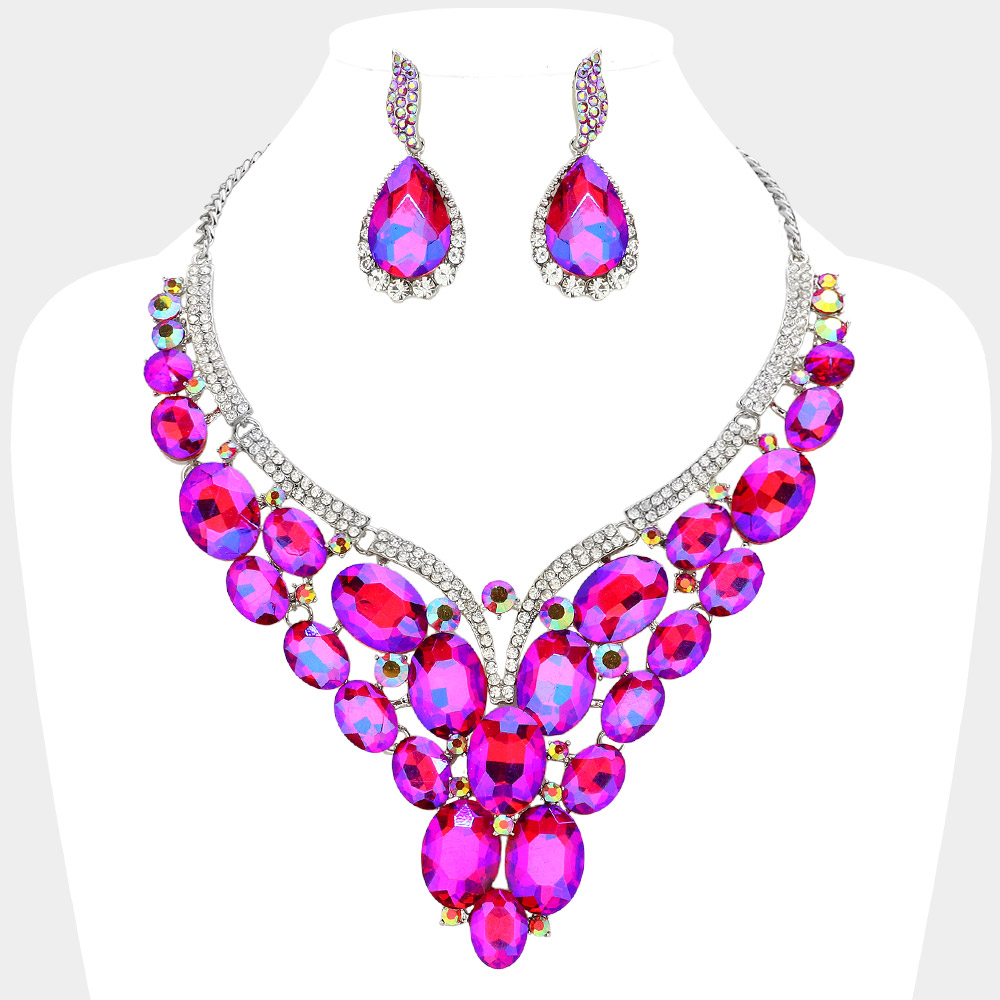 Oval Glass Stone Cluster Embellished Evening Necklace