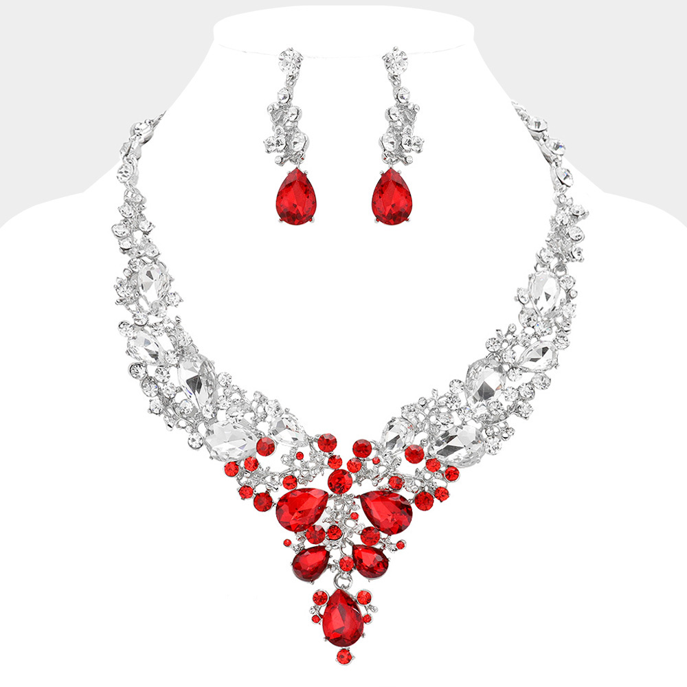 • Stunning statement jewelry set featuring a bold necklace and matching dangle earrings with teardrop accents. Perfect for weddings, parties, and formal events, this elegant set adds glamour and sophistication, making it an ideal accessory for special occasions.