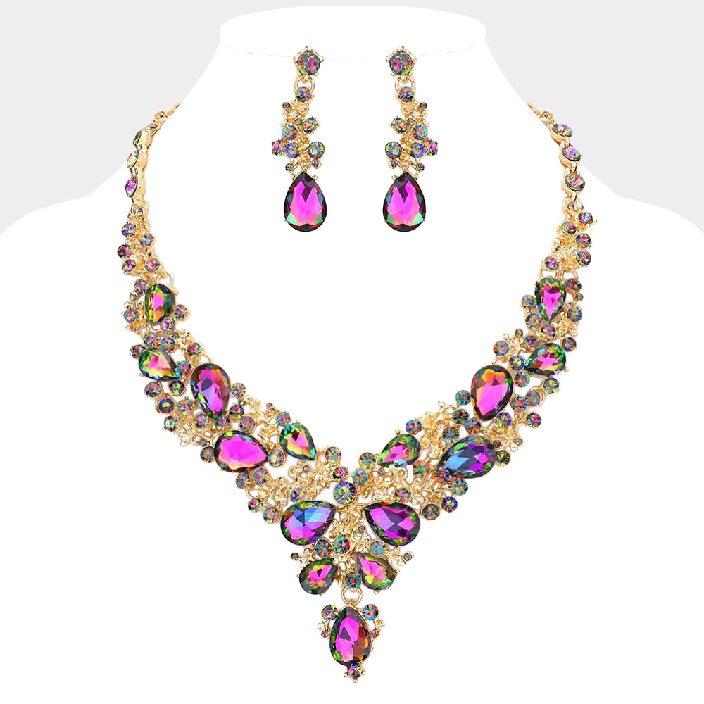 Details • Necklace Size : 20" + 3" L • Decor Size : 2.75" L • Earring Size : 2.25" L • Stunning statement jewelry set featuring a bold necklace and matching dangle earrings with teardrop accents. Perfect for weddings, parties, and formal events, this elegant set adds glamour and sophistication, making it an ideal accessory for special occasions.