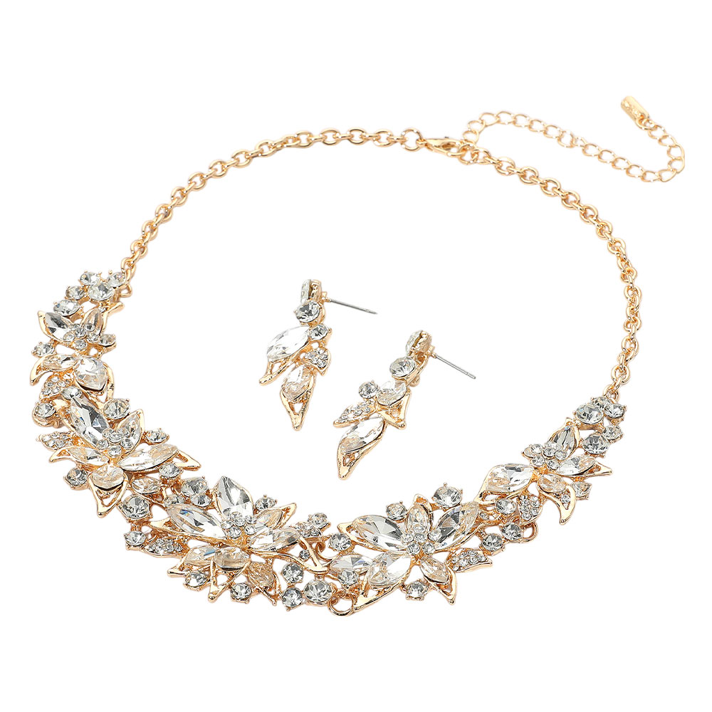 • Elegant jewelry set featuring a floral-inspired statement necklace with matching drop earrings. Designed with sparkling gemstone details that add glamour and refinement. Perfect for weddings, parties, or special occasions, creating a radiant and sophisticated look.