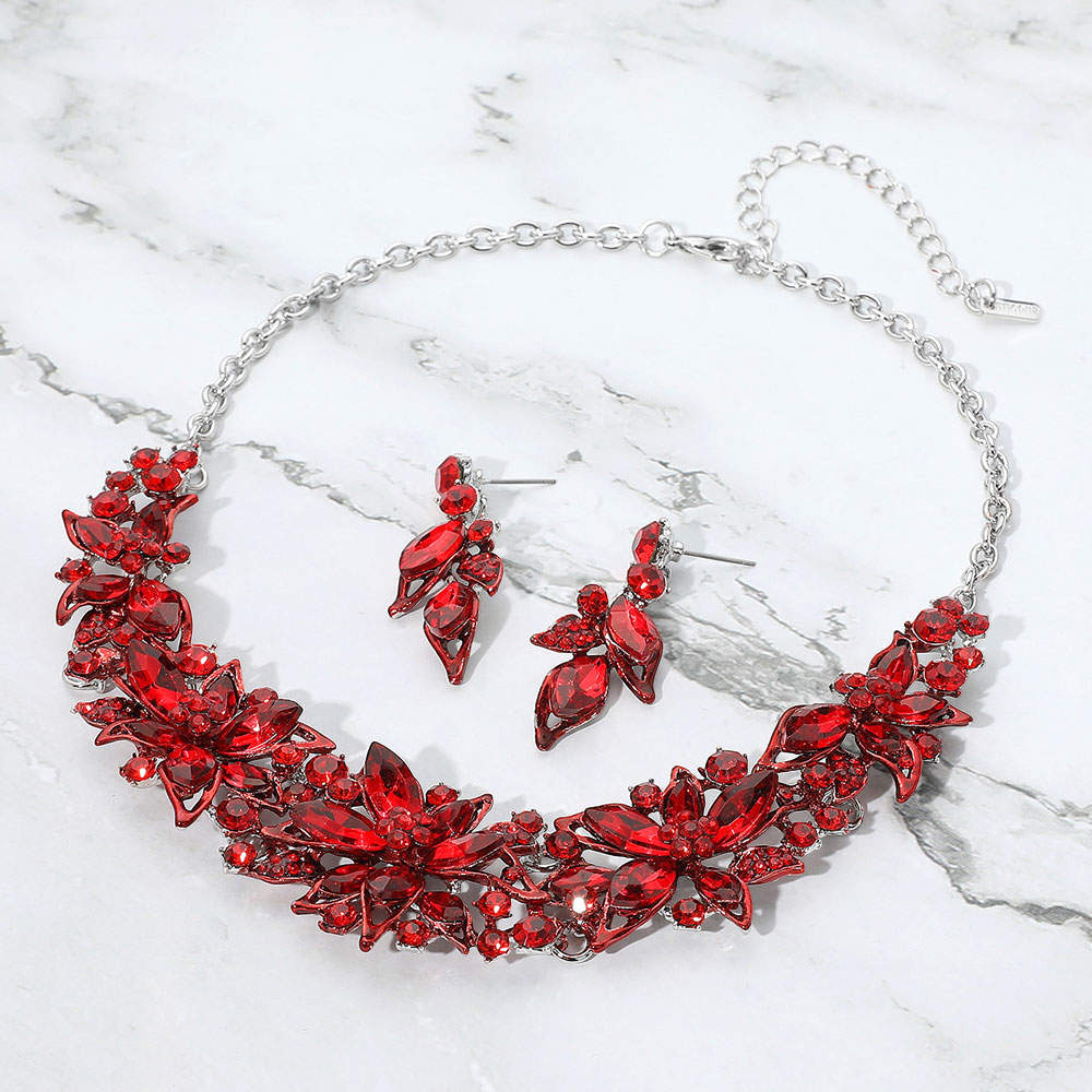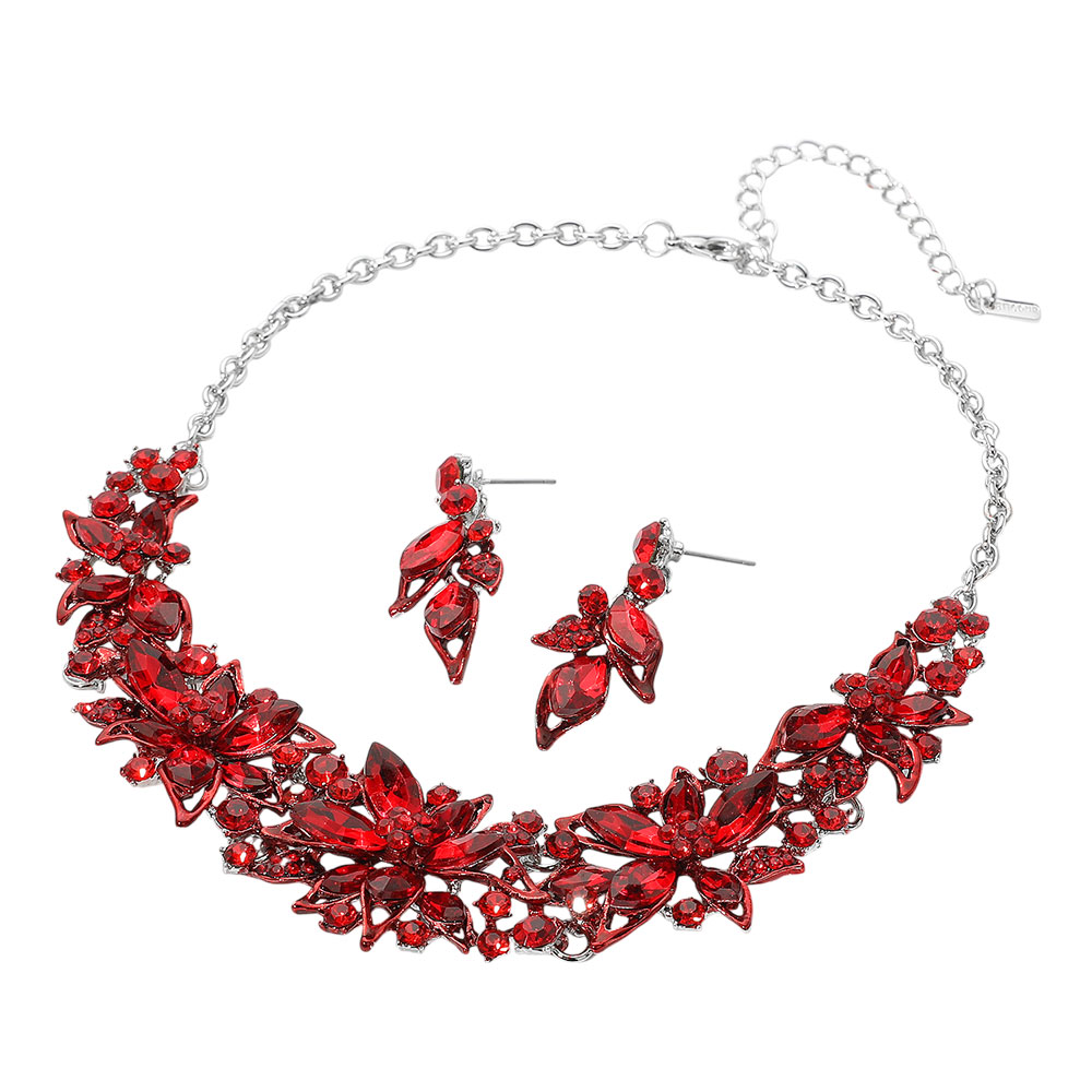 Details • Necklace Size : 18" + 4" L • Decor Size : 1.5" L • Earrings Size : 1.8" L • Elegant jewelry set featuring a floral-inspired statement necklace with matching drop earrings. Designed with sparkling gemstone details that add glamour and refinement. Perfect for weddings, parties, or special occasions, creating a radiant and sophisticated look. • Lead and Nickel Compliant