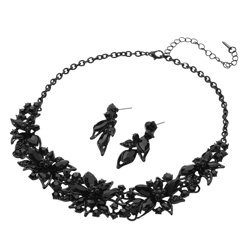 Details • Necklace Size : 18" + 4" L • Decor Size : 1.5" L • Earrings Size : 1.8" L • Elegant jewelry set featuring a floral-inspired statement necklace with matching drop earrings. Designed with sparkling gemstone details that add glamour and refinement. Perfect for weddings, parties, or special occasions, creating a radiant and sophisticated look. • Lead and Nickel Compliant