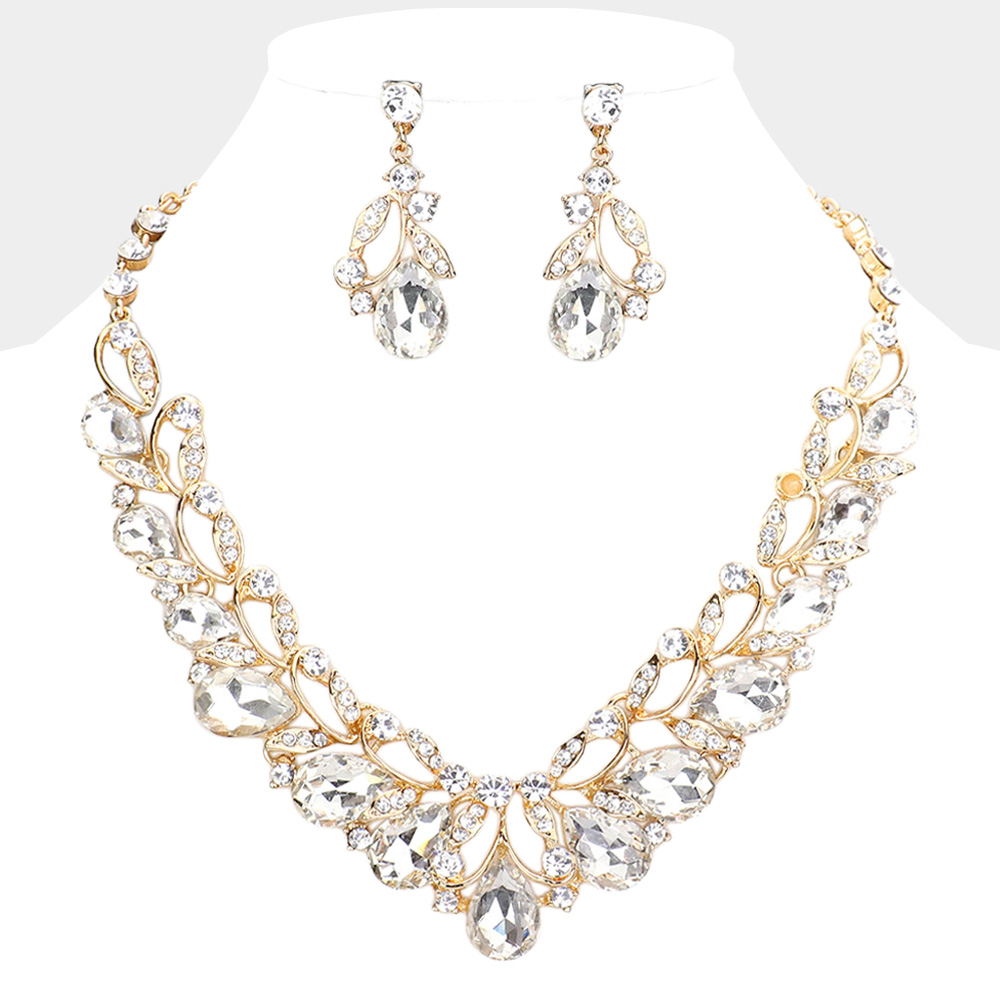 Teardrop Accented Stone Embellished Leaf Evening Necklace