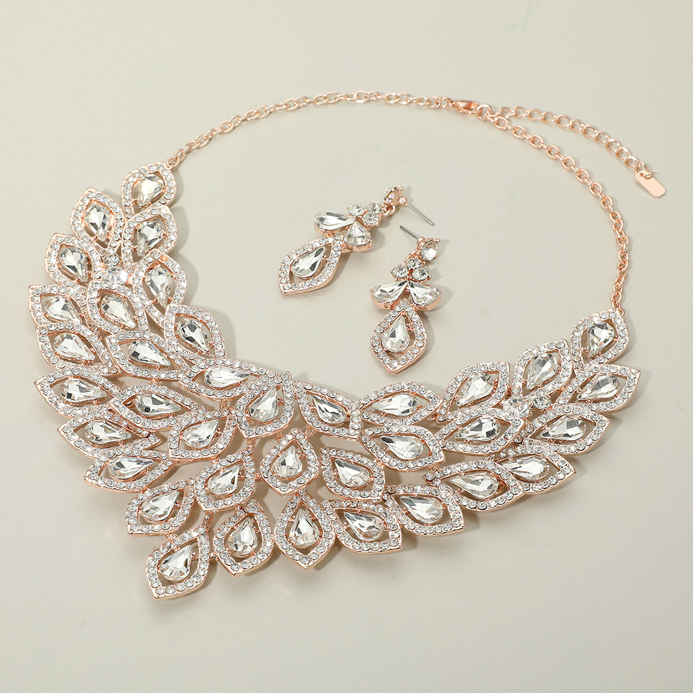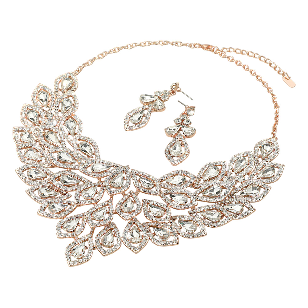 • This elegant jewelry set features a leaf-inspired statement necklace adorned with sparkling gem accents, paired with matching drop earrings. Perfect for evening wear or formal occasions, it adds a refined yet bold touch to any sophisticated look.