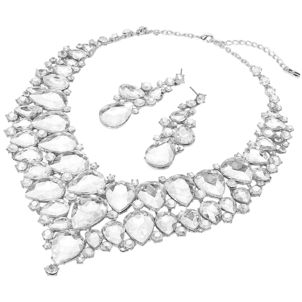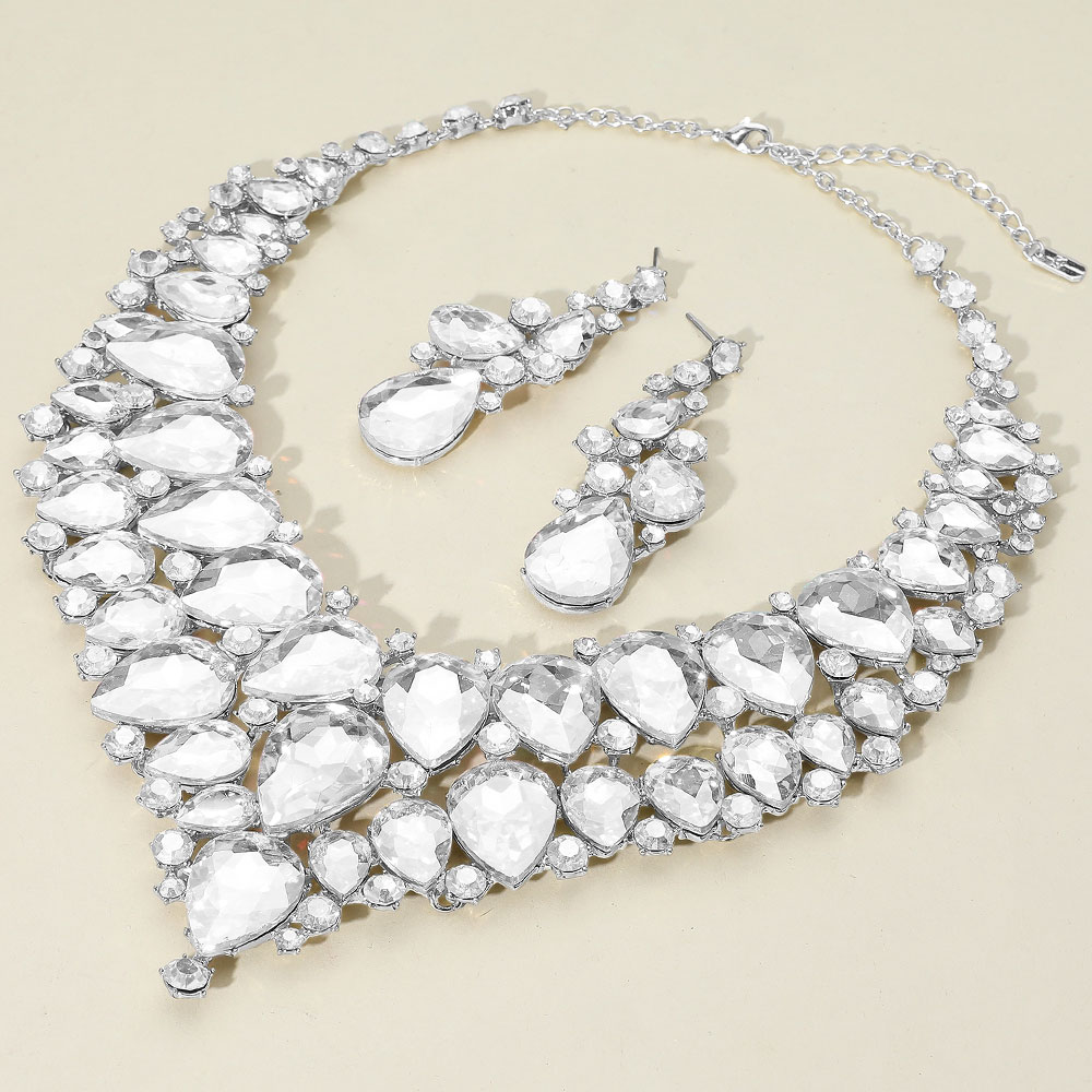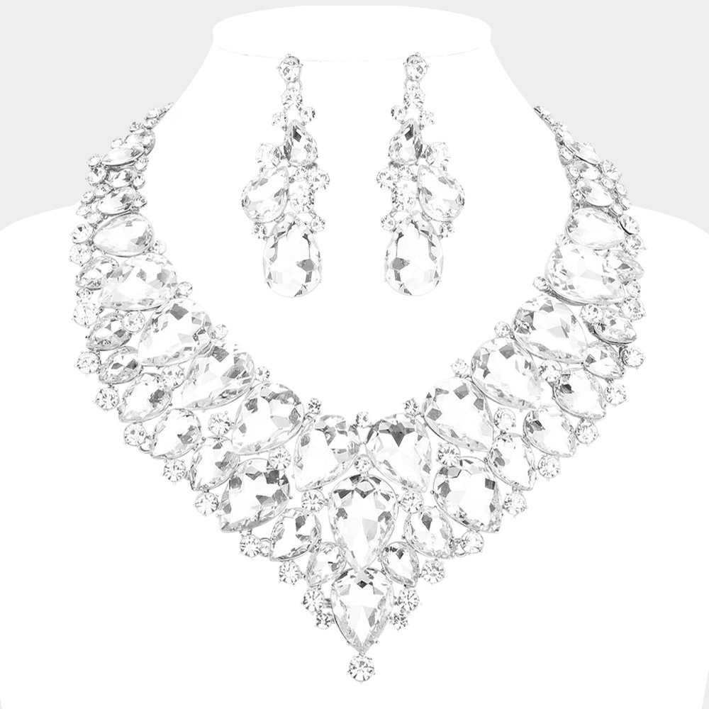 Details • Necklace Size : 16" + 3" L • Decor Size : 3" L • Earrings Size : 2.5" L • Elegant teardrop gem necklace and earring set designed to make a statement. Ideal for evening events, proms, or weddings with a dramatic and glamorous look that enhances any outfit.