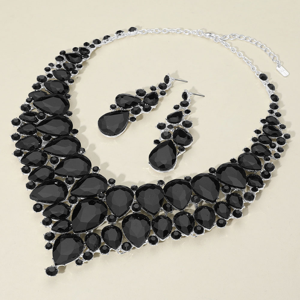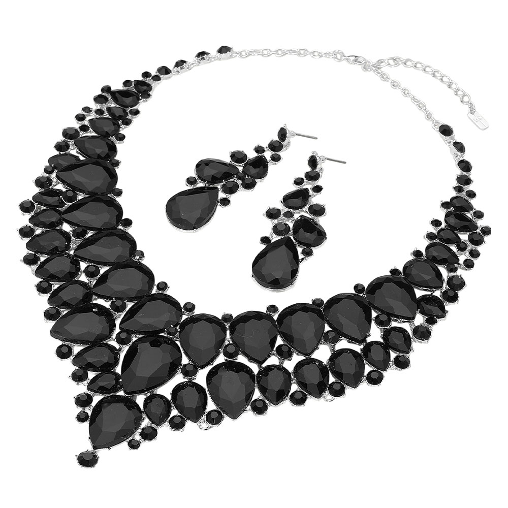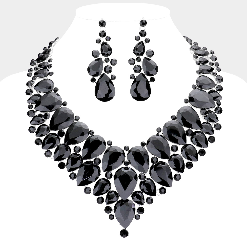 Details • Necklace Size : 16" + 3" L • Decor Size : 3" L • Earrings Size : 2.5" L • Elegant teardrop gem necklace and earring set designed to make a statement. Ideal for evening events, proms, or weddings with a dramatic and glamorous look that enhances any outfit.