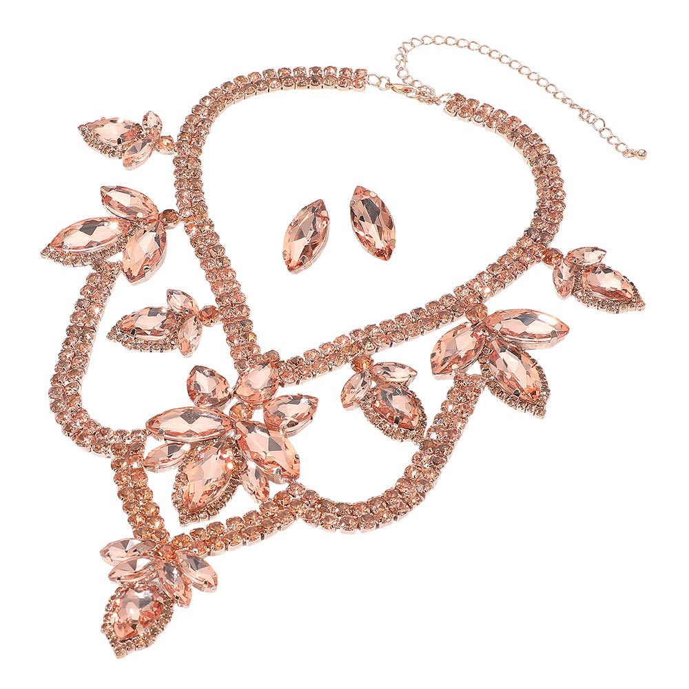 Details • Necklace Size : 15.5" + 7" L • Decor Size : 5" L • Earring Size : 1" L • Elegant statement bib necklace and earring set featuring sparkling crystal leaf clusters and layered detailing for a glamorous, eye-catching finish. Perfect for evening events, formals, weddings, and special occasions, adding radiant shine and dramatic sophistication to any standout look.
