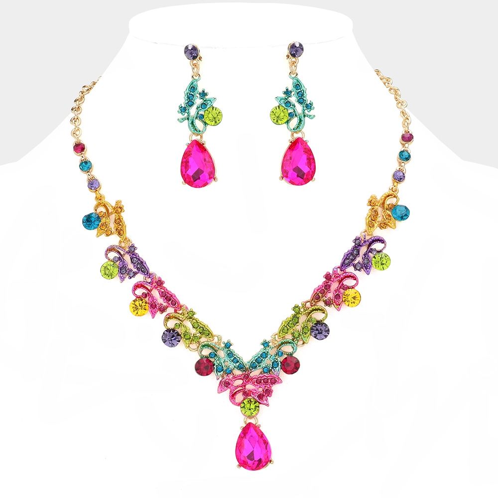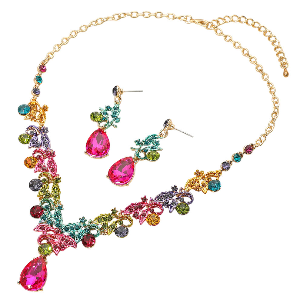 Teardrop Round Stone Accented Leaf Evening Necklace