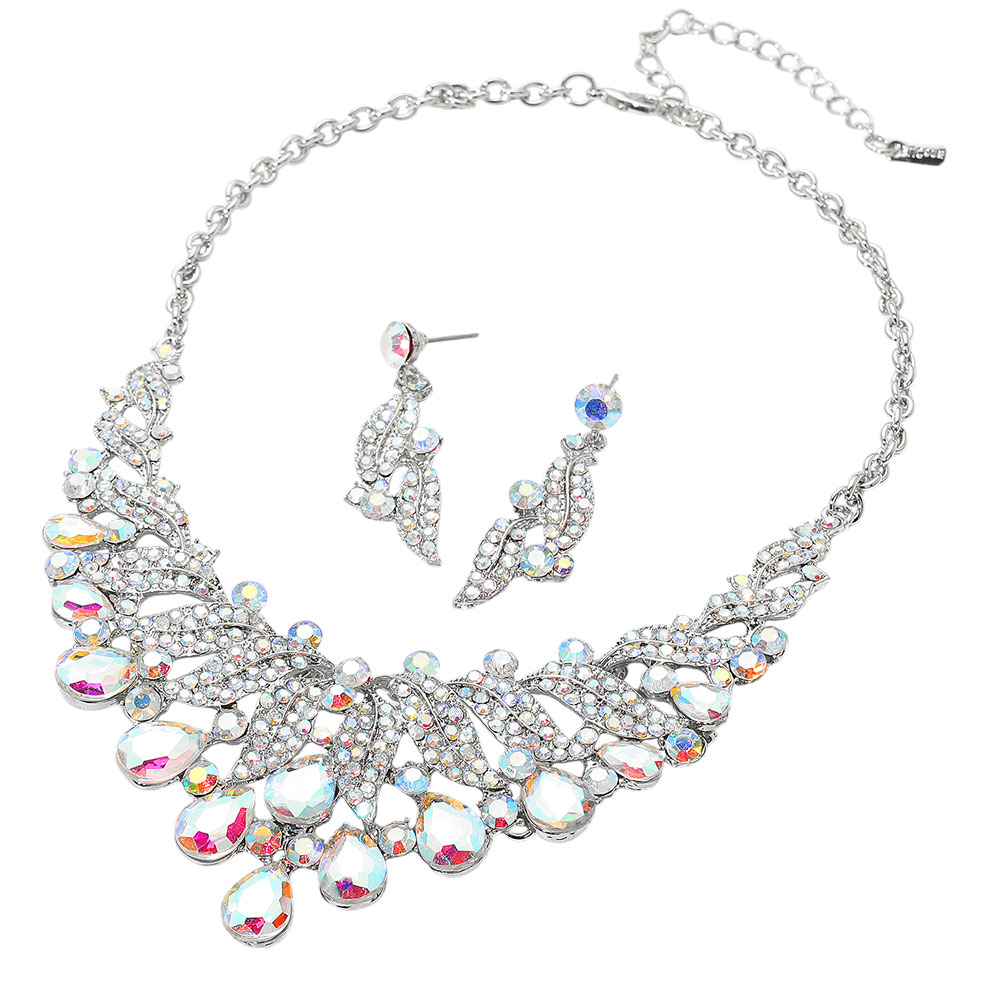 Details • Necklace Size : 19" + 4" L • Decor Size : 2.1" L • Earrings Size : 1.5" L • Luxurious jewelry set featuring an ornate leaf-patterned necklace and matching teardrop earrings. Perfect for evening events, weddings, or special occasions, adding sophistication and glamour. A bold statement piece that enhances any elegant outfit with radiant charm and style. • Lead and Nickel Compliant