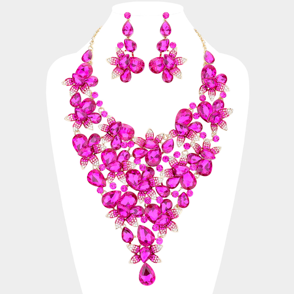 Teardrop Stone Leaf Cluster Vine Statement Evening Necklace