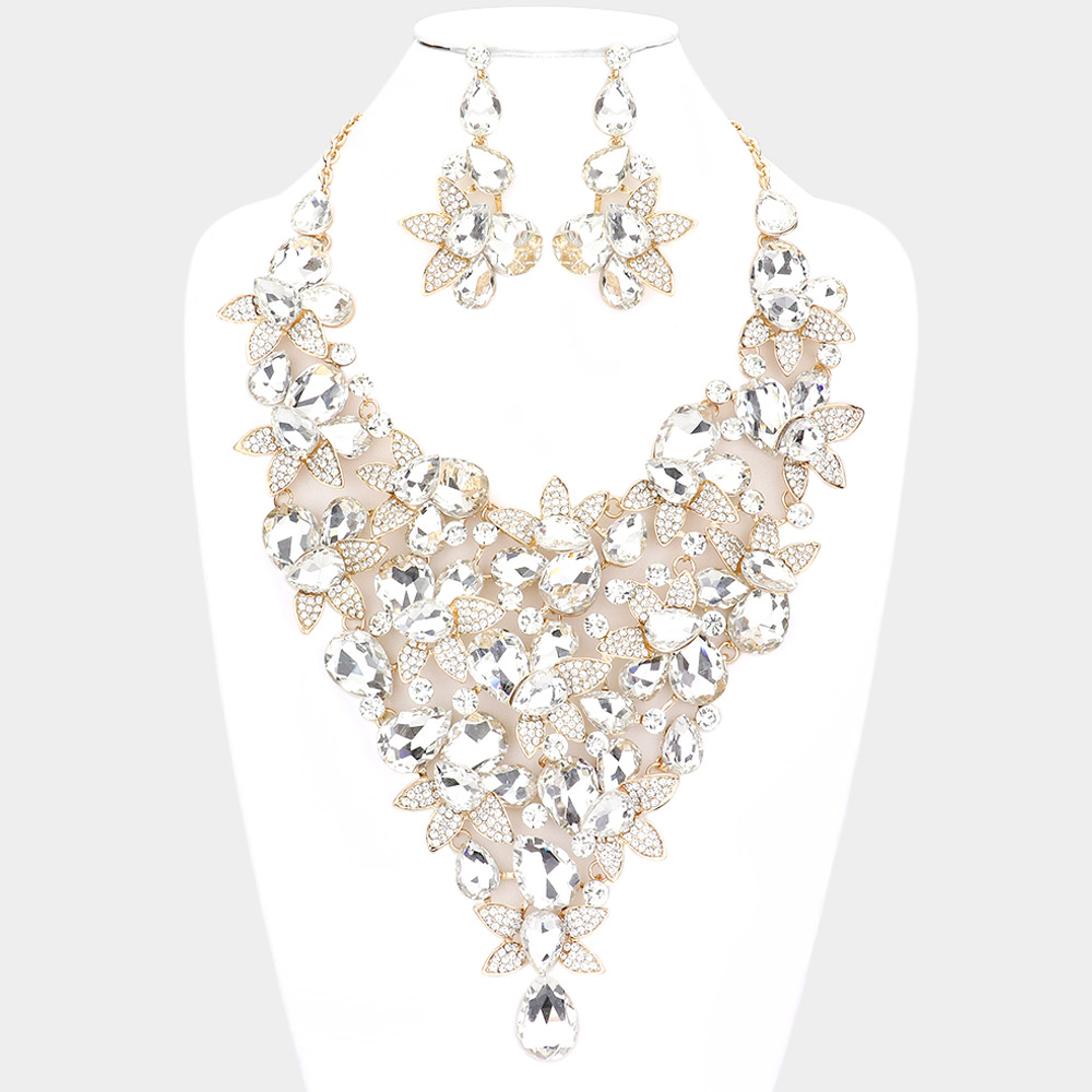 Teardrop Stone Leaf Cluster Vine Statement Evening Necklace