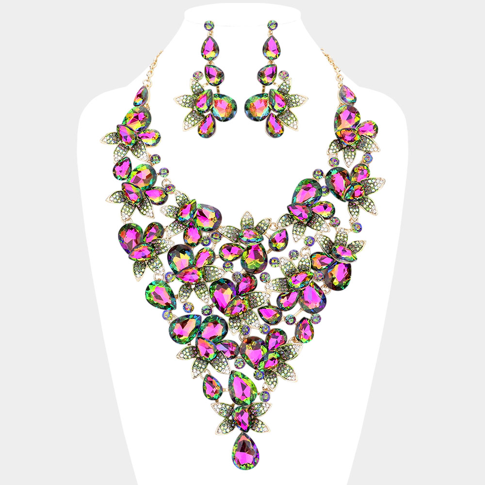 Teardrop Stone Leaf Cluster Vine Statement Evening Necklace
