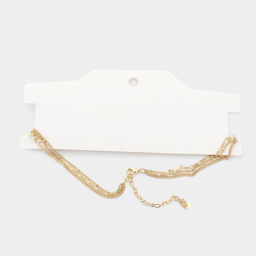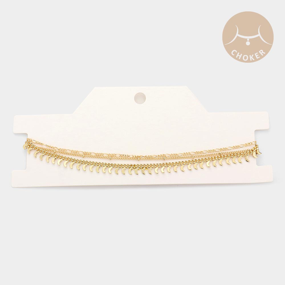 Crescent Moon Detailed Triple Layered Brass Metal Chain Necklace