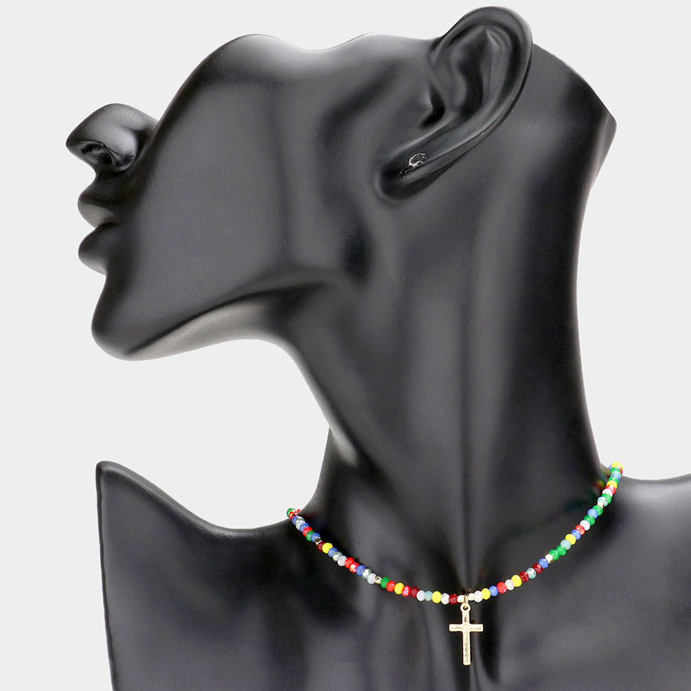 Abalone Embossed Antique Metal Cross Pendant Necklace