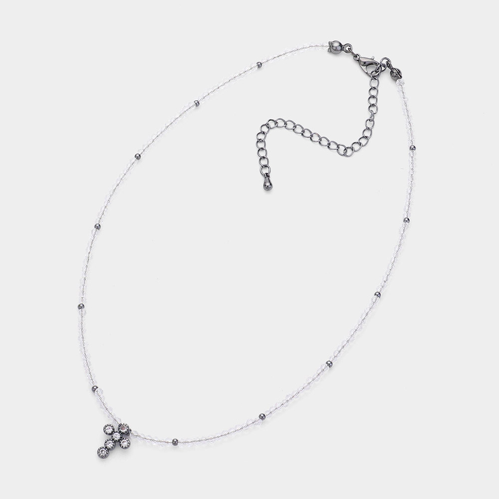 CZ Stone Embellished Cross Pendant Faceted Beaded Choker Necklace