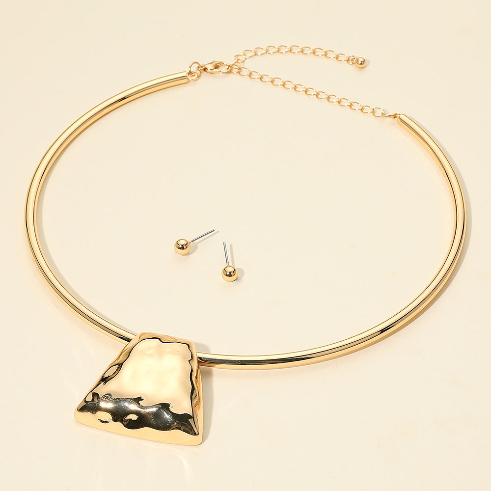 Details • Necklace Size : 14" + 4" L, 5.5" D • Decor Size : 1.5" L • Earrings Size : 0.2" L • A bold choker necklace featuring a unique geometric pendant with a hammered finish, paired with simple stud earrings. The modern design blends minimalism with an artistic edge, making it an easy statement piece for both casual and dressy looks. Lightweight and versatile, this set adds instant style to any outfit. • Lead and Nickel Compliant