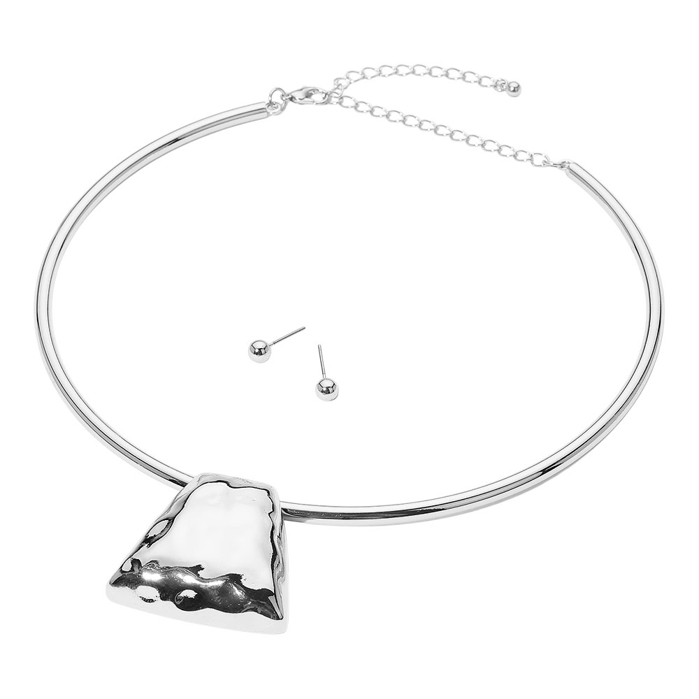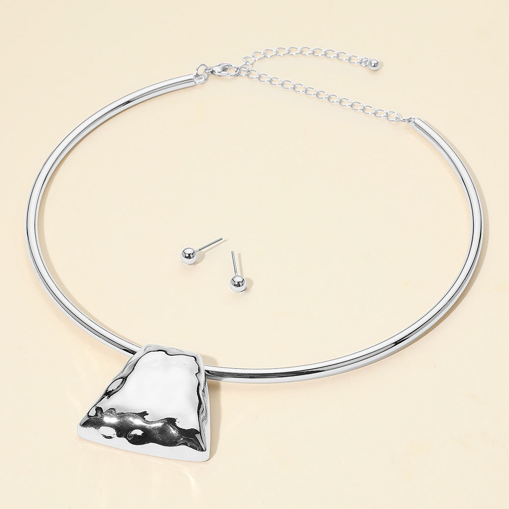 Details • Necklace Size : 14" + 4" L, 5.5" D • Decor Size : 1.5" L • Earrings Size : 0.2" L • A bold choker necklace featuring a unique geometric pendant with a hammered finish, paired with simple stud earrings. The modern design blends minimalism with an artistic edge, making it an easy statement piece for both casual and dressy looks. Lightweight and versatile, this set adds instant style to any outfit. • Lead and Nickel Compliant