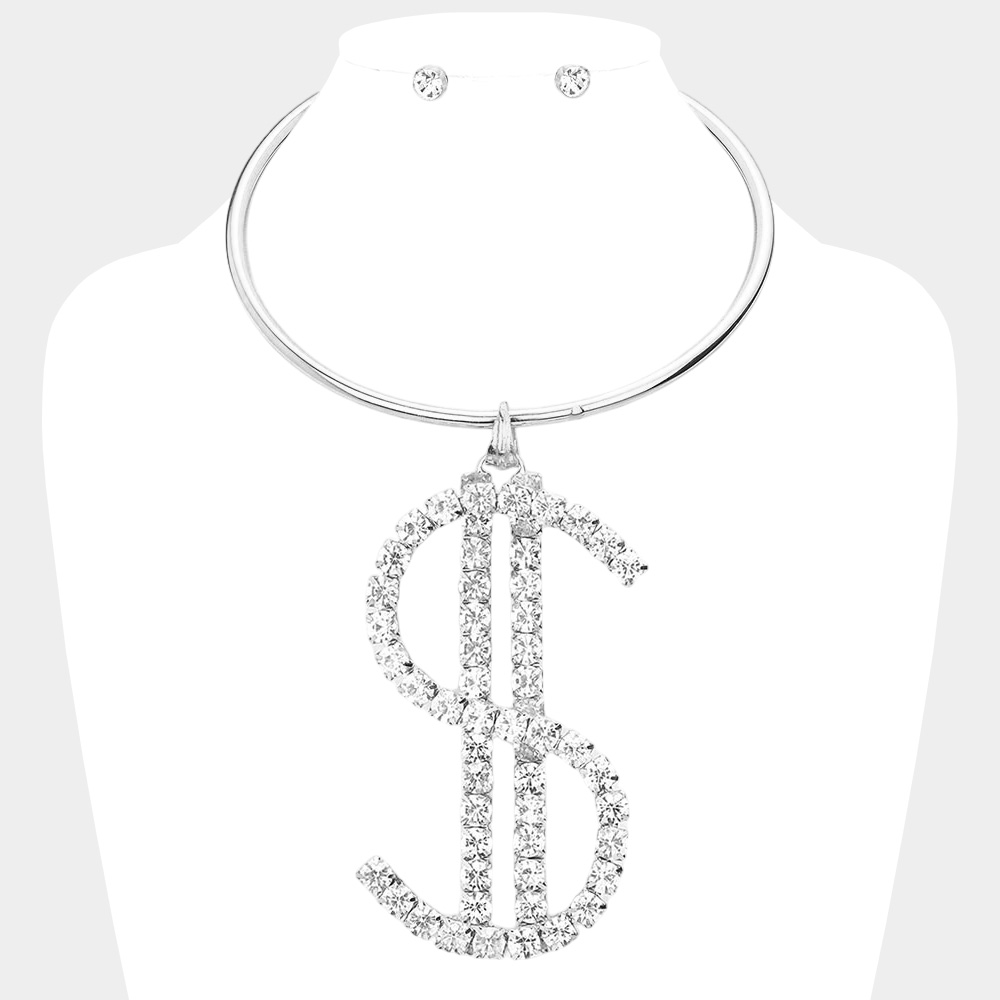 Oversized Rhinestone Pave Dollar Sign Pendant Choker Necklace