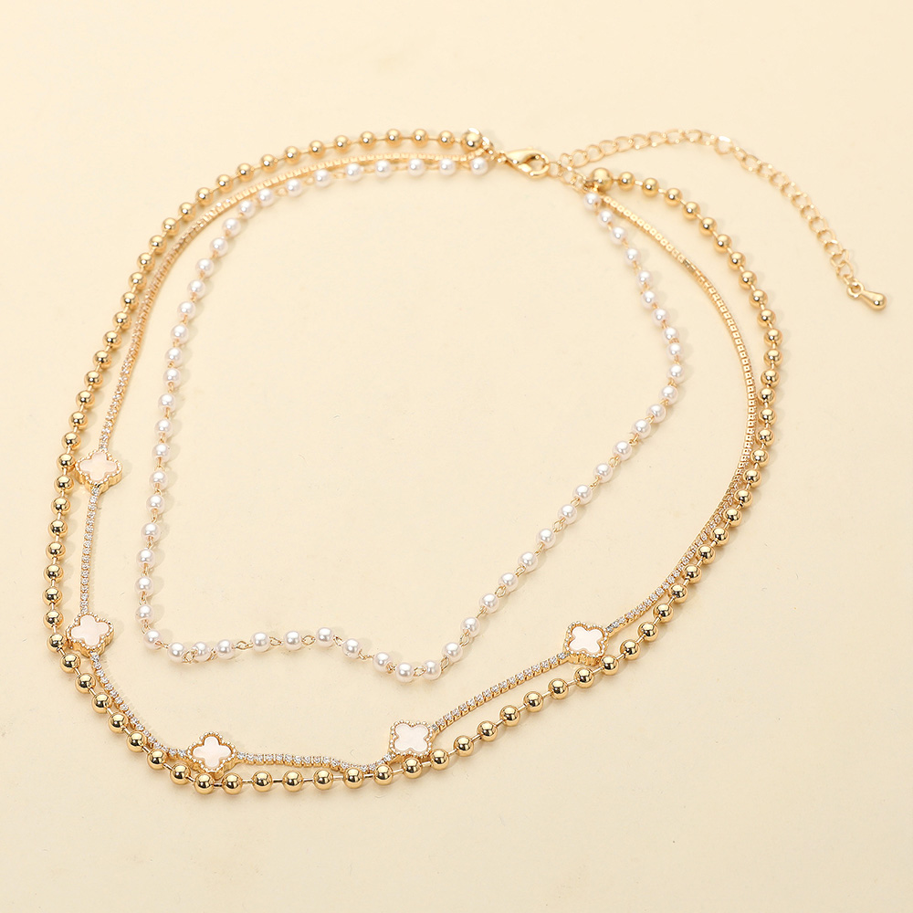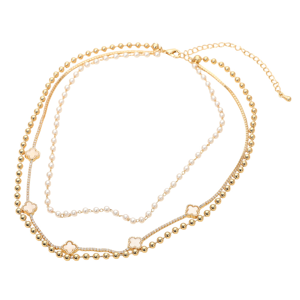 Details • Necklace Size : 14" + 3.25" L • Decor Size : 1.5" L • This layered necklace combines beaded strands, delicate pearls, and quatrefoil-shaped accents for a refined, modern look. Designed with an adjustable chain for the perfect fit, it’s an elegant statement piece ideal for elevating everyday ensembles or complementing evening wear. • Lead and Nickel Compliant
