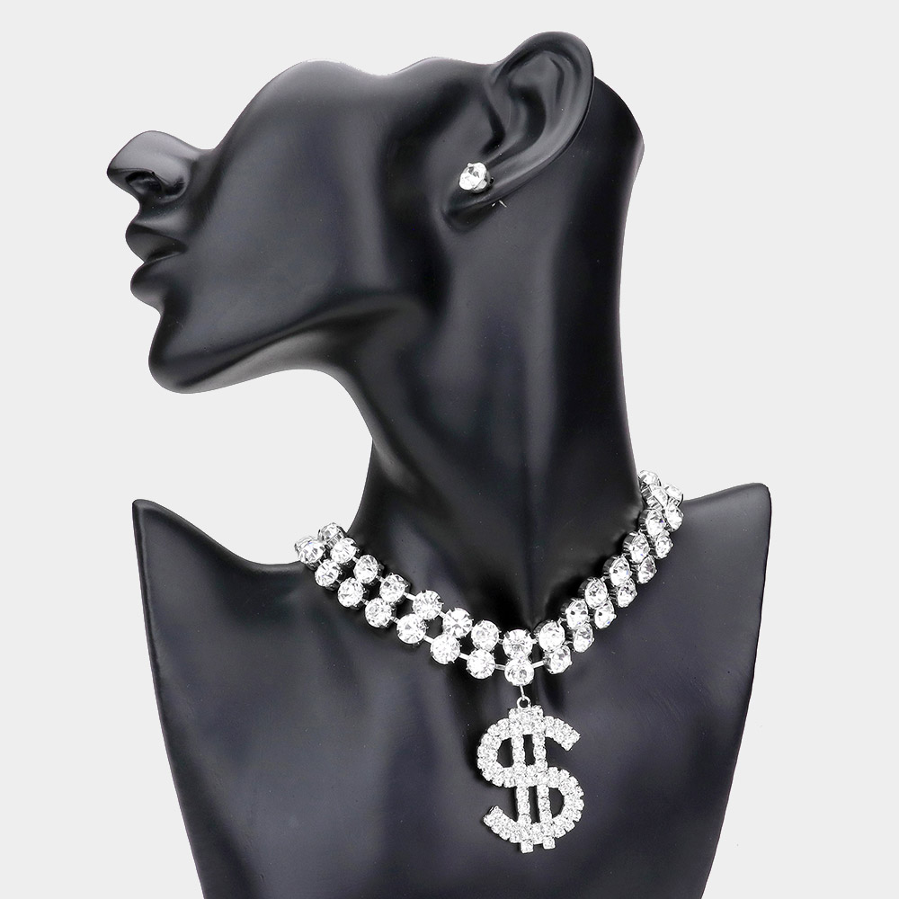 Rhinestone Embellished Metal Dollar Sign Pendant Choker Necklace