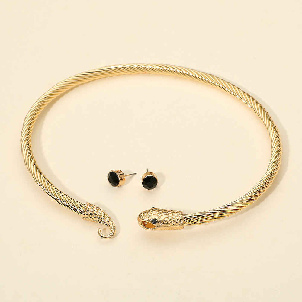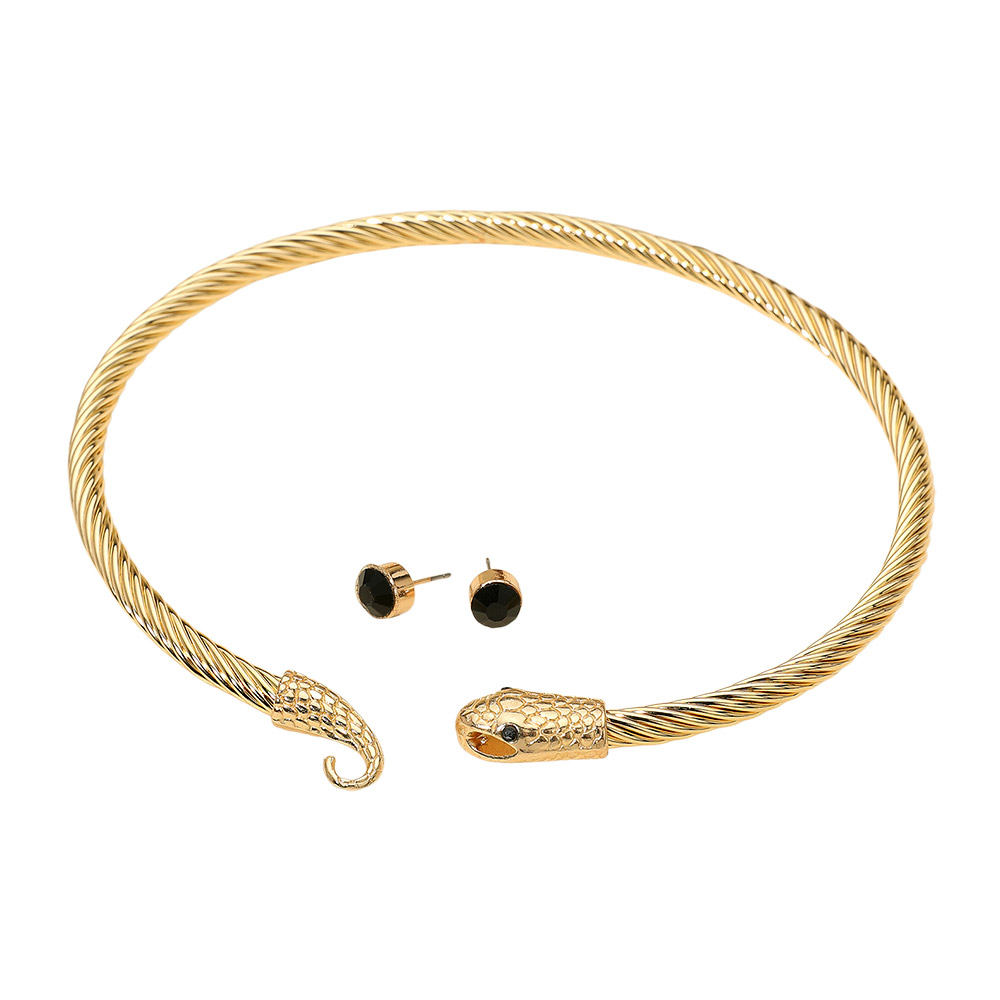 Details • Size : 15" L • Decor Size : 0.7" L • Earrings Size : 0.3" L • Hook Closure • This snake torque necklace features a twisted metal design with detailed serpent heads at each end, paired with sleek matching stud earrings. A bold and stylish jewelry set that adds a striking, edgy flair to your outfit, perfect for statement wear or enhancing modern and elegant fashion looks. • Lead and Nickel Compliant