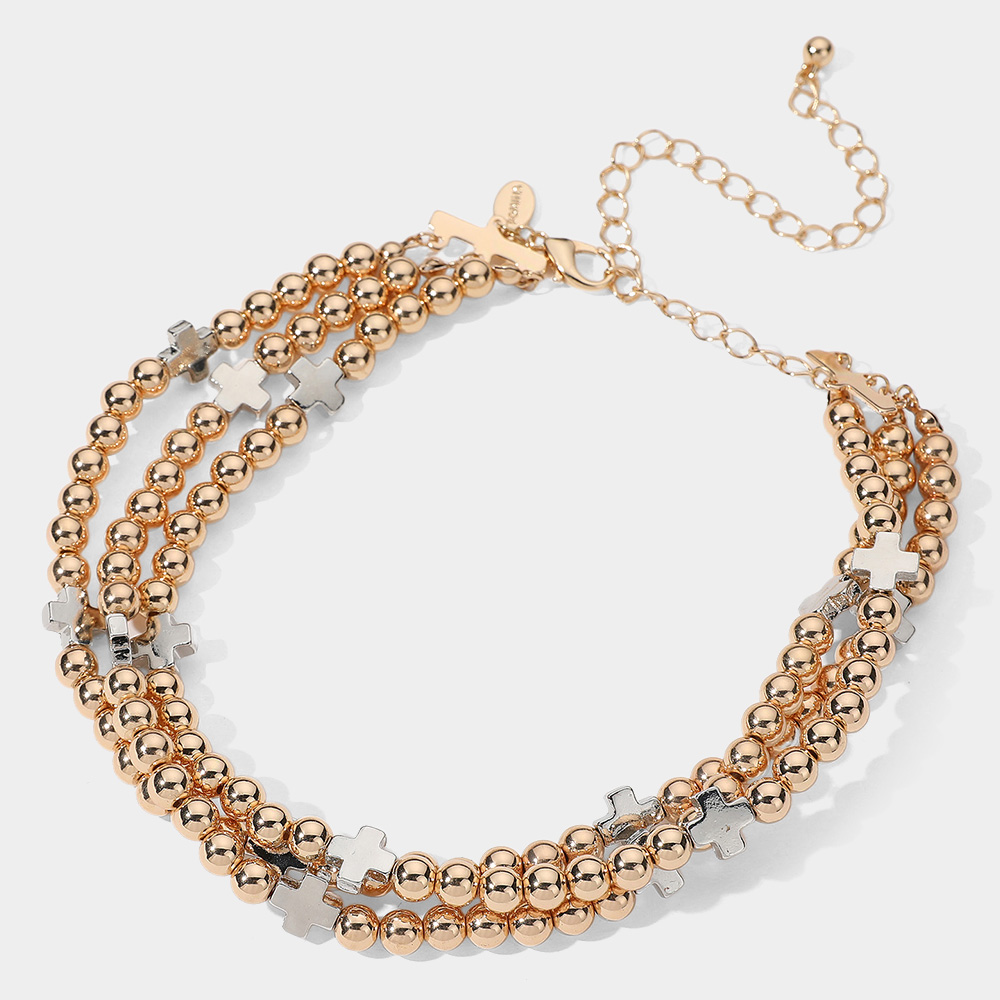 Triple Metal Cross Ball Beaded Layered Strand Choker Necklace