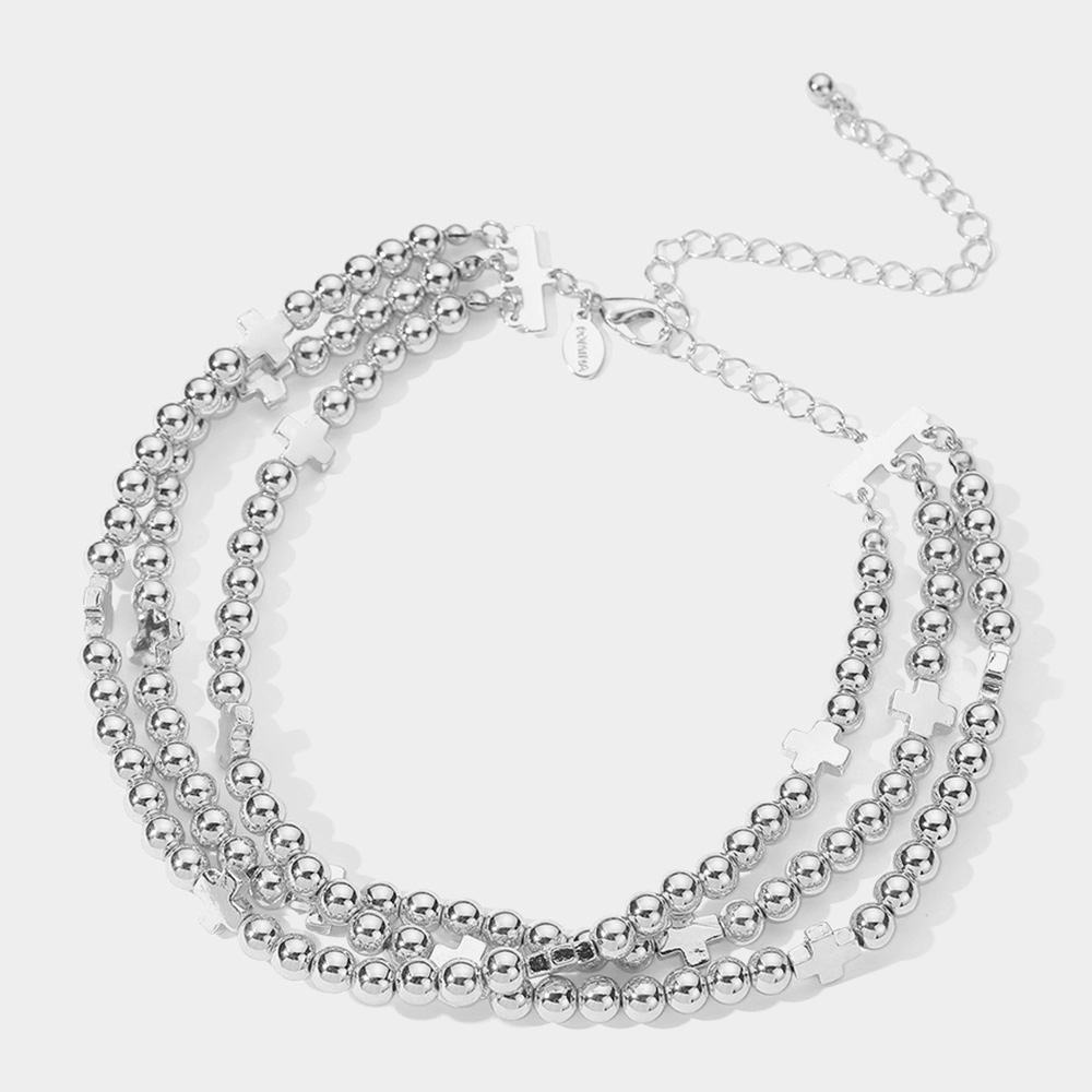 Triple Metal Cross Ball Beaded Layered Strand Choker Necklace
