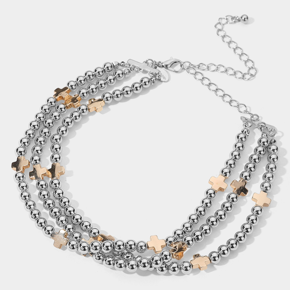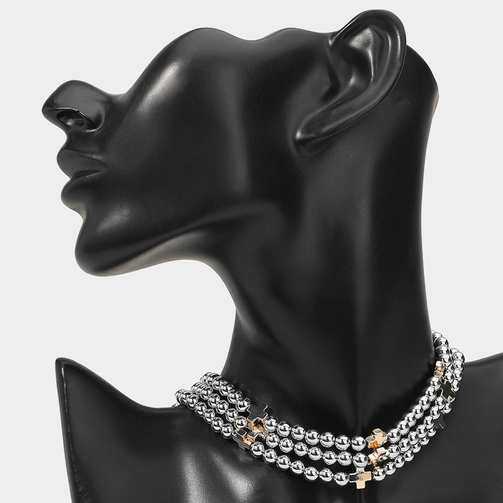 Triple Metal Cross Ball Beaded Layered Strand Choker Necklace