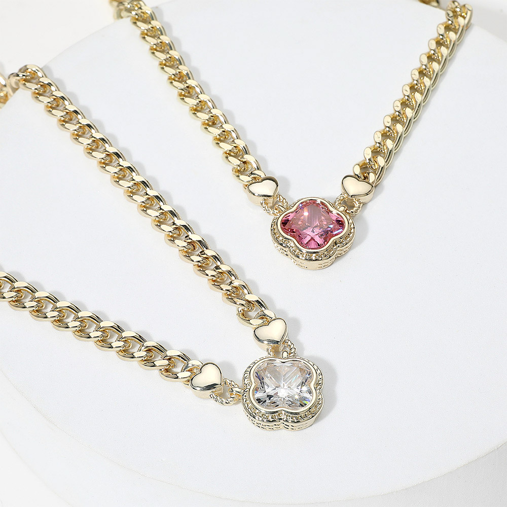 14K Gold Plated CZ Quatrefoil Pendant Pointed Chain Necklace