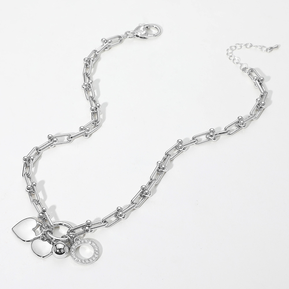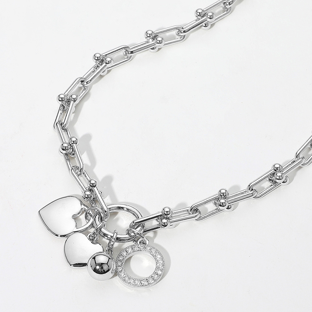Details • Necklace Size : 17.5" + 3.75" L • Pendant Size : 1.7" L • Modern chunky chain necklace adorned with heart and circle charms, including a crystal-embellished pendant. A bold yet elegant statement piece perfect for everyday or evening wear. • Gold Dipped • CZ Cubic Zirconia