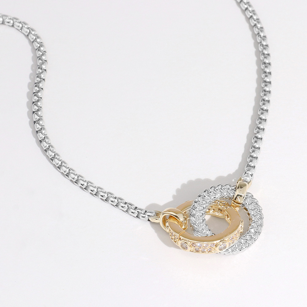 Details • Necklace Size : 17" + 2.5" L • Decor Size : 0.75" L • Stylish necklace featuring interlocking circular loops on a sleek box chain. The central design element creates a harmonious and balanced look, ideal for modern everyday wear or subtle elegance. • Gold Dipped • CZ Cubic Zirconia