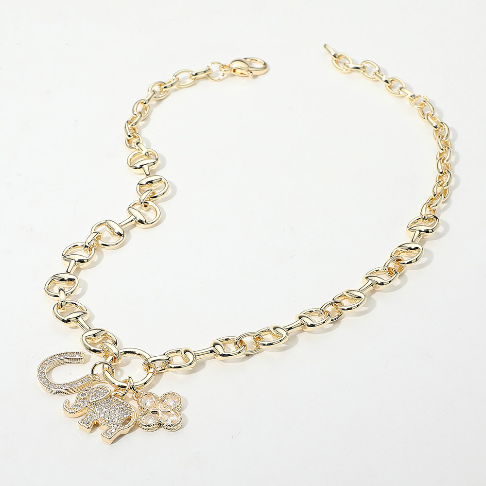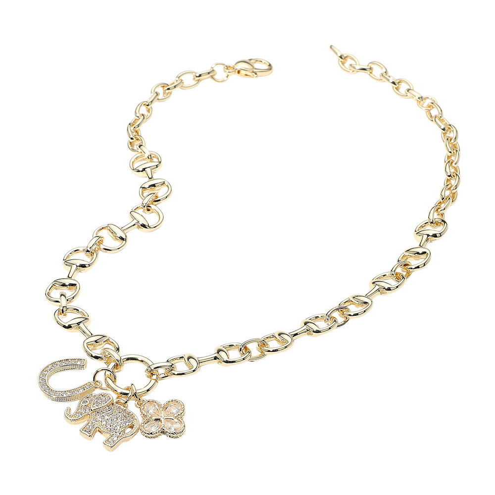 14K Gold Plated CZ Stone Paved Elephant Horseshoe Clover Charm Horsebit Chain Necklace 14K Gold Plated CZ Stone Paved Elephant Horseshoe Clover Charm Horsebit Chain Necklace 14K Gold Plated CZ Stone Paved Elephant Horseshoe Clover Charm Horsebit Chain Necklace