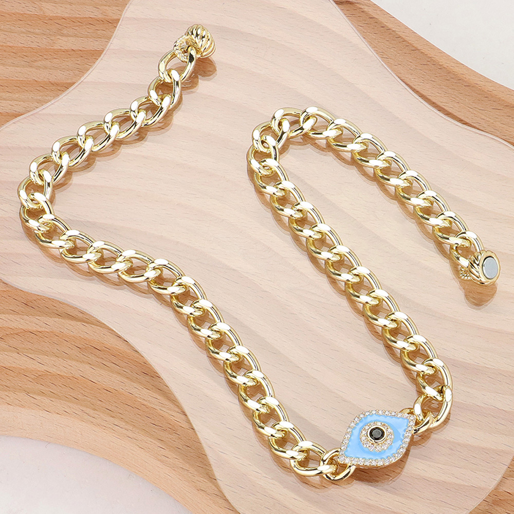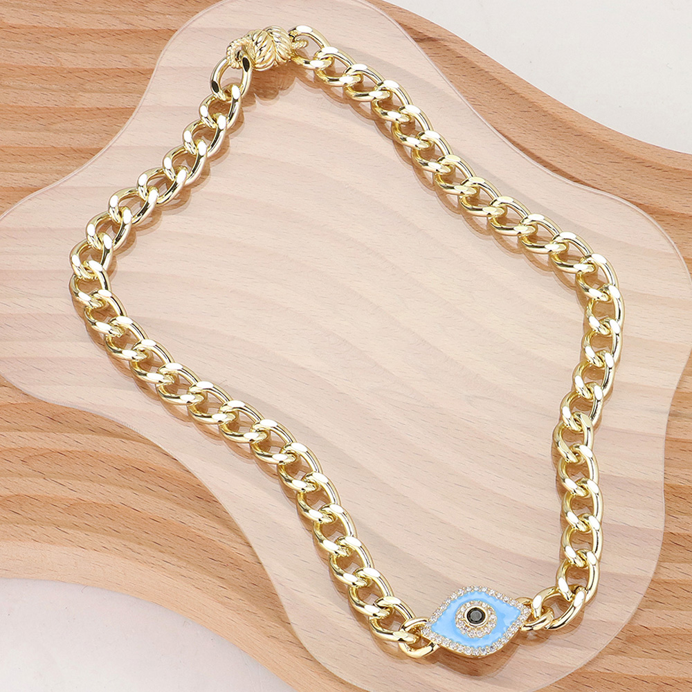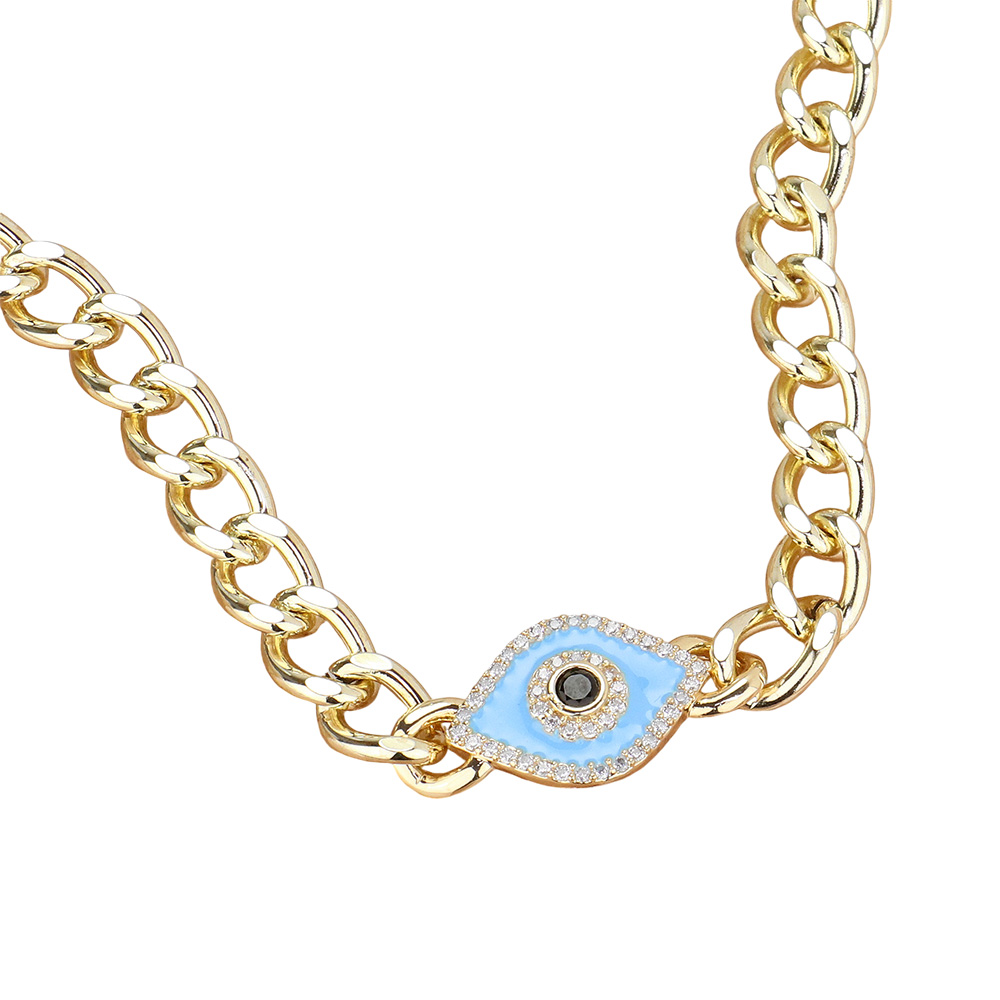 14K Gold Plated CZ Stone Paved Enamel Evil Eye Pendant Pointed Cuban Chain Necklace