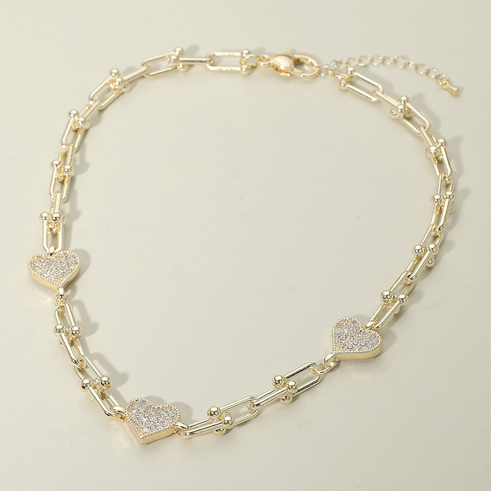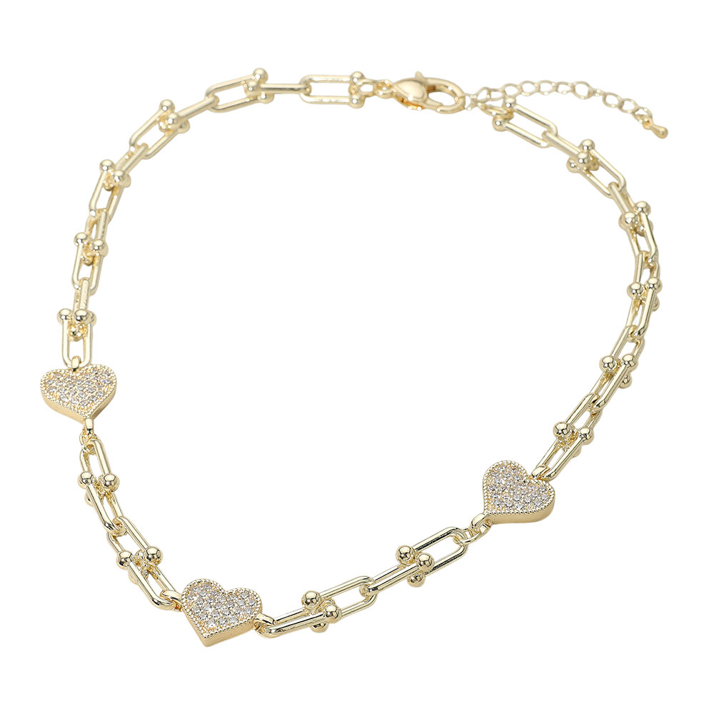 Details • Necklace Size : 17" + 2" L • Decor Size : 0.7" L • Elegant necklace featuring three sparkling heart charms accented with crystals along a contemporary link chain. A versatile accessory that blends romance and modern style, perfect for layering or wearing solo to add a touch of brilliance. • CZ Cubic Zirconia • Gold Dipped