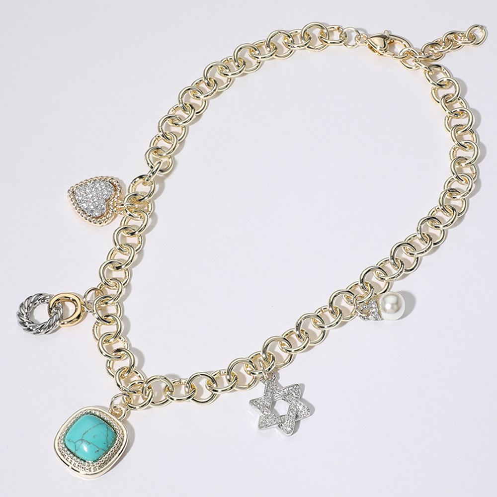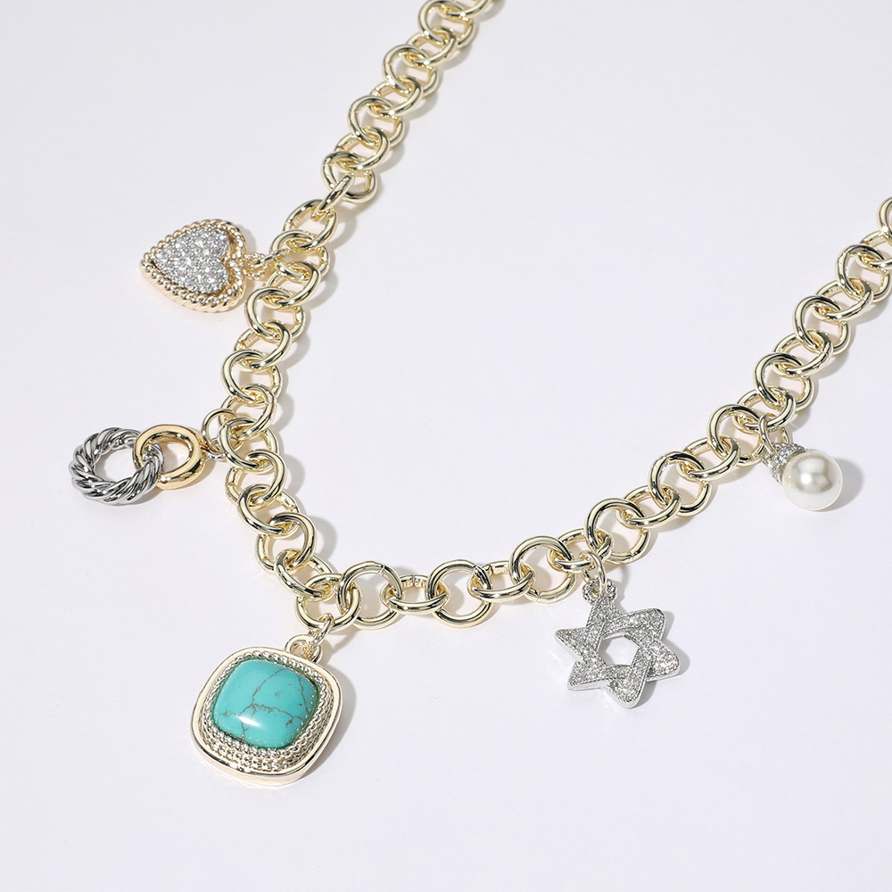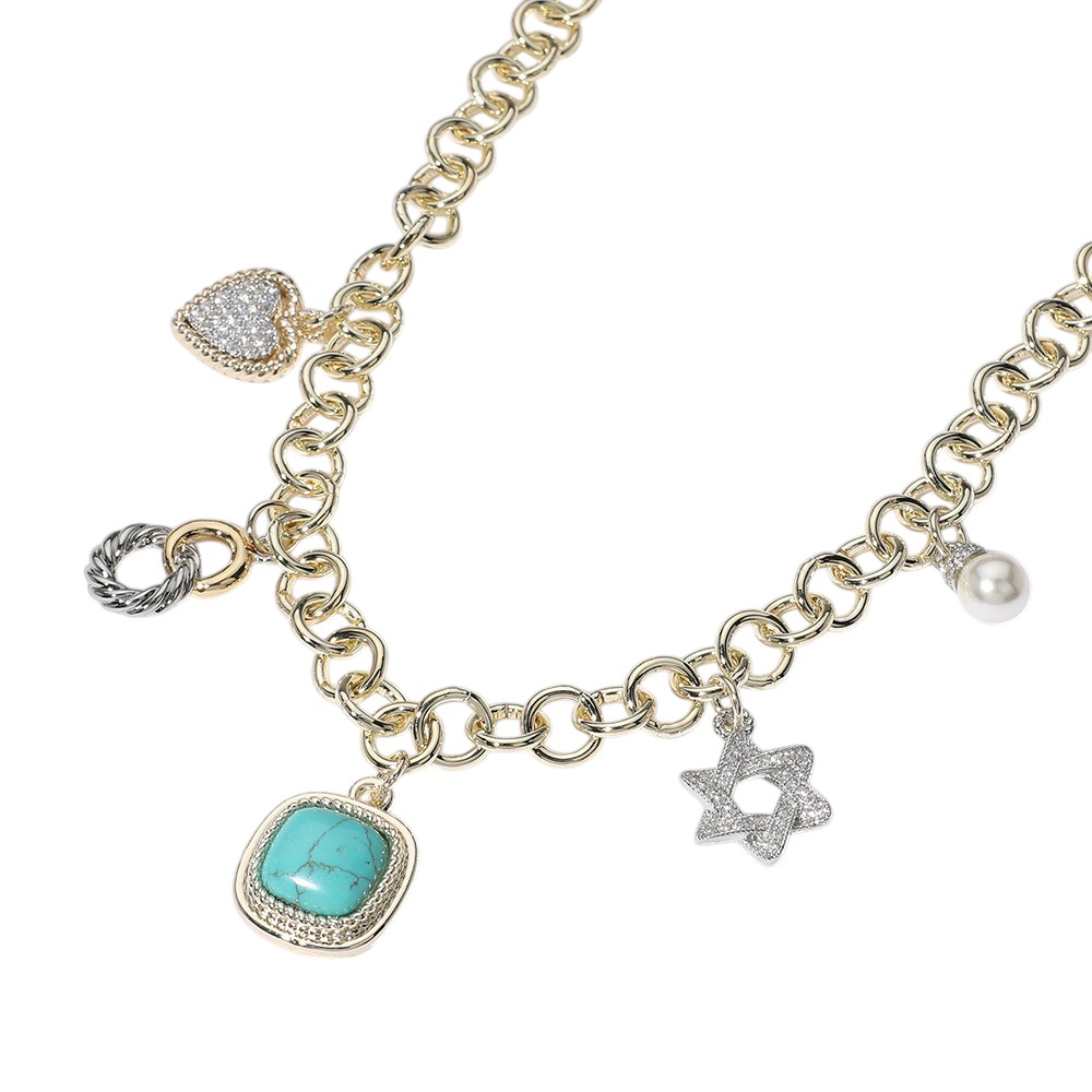 14K Gold Plated CZ Stone Paved Heart Jewish Star Pearl Western Turquoise Stone Cluster Charm Station Bracelet
