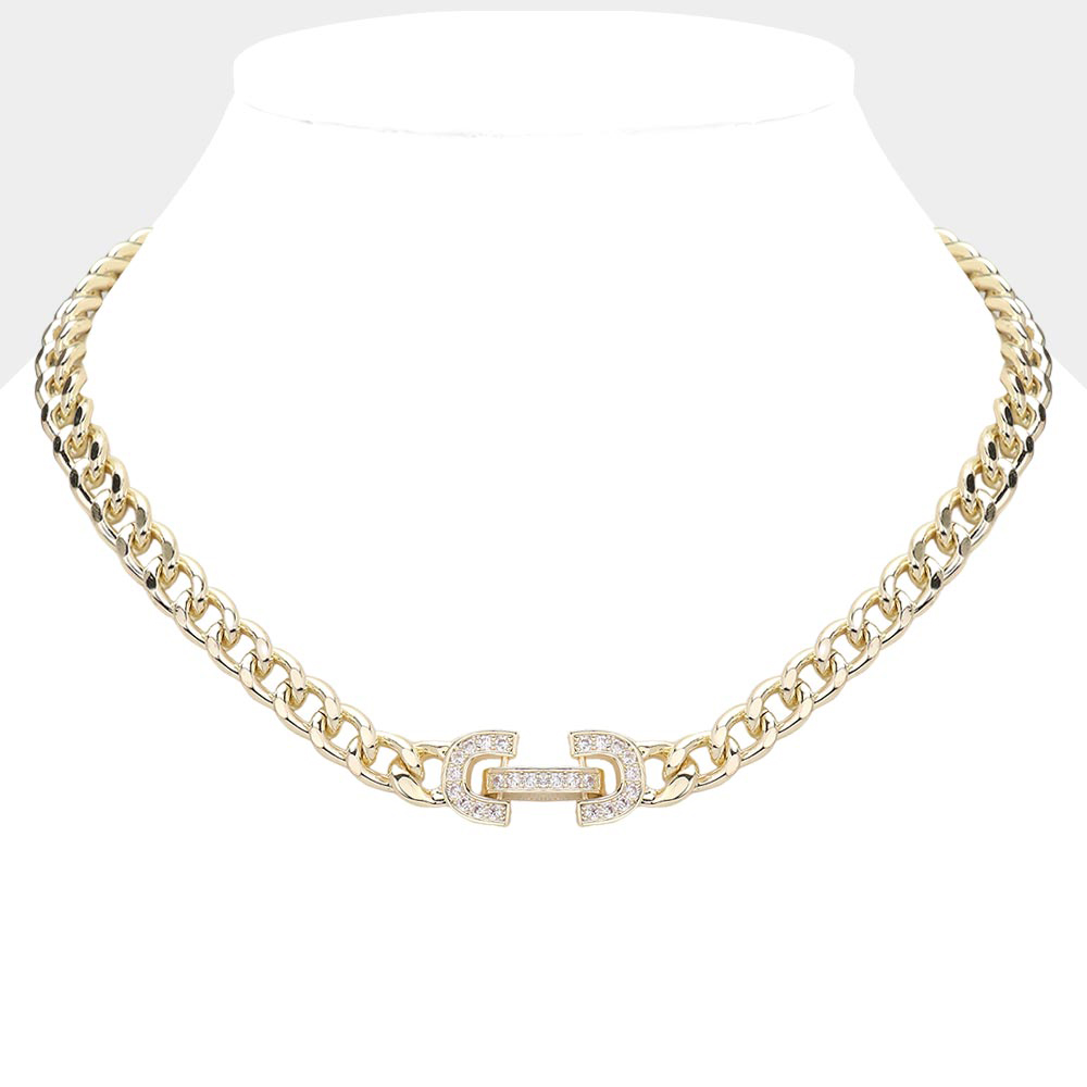 14K Gold Plated CZ Stone Paved Lock Pointed Chain Necklace