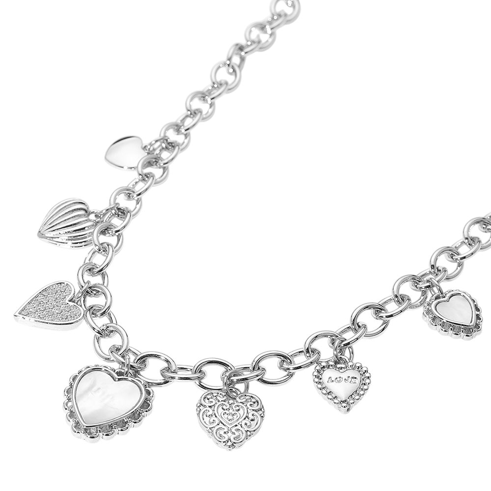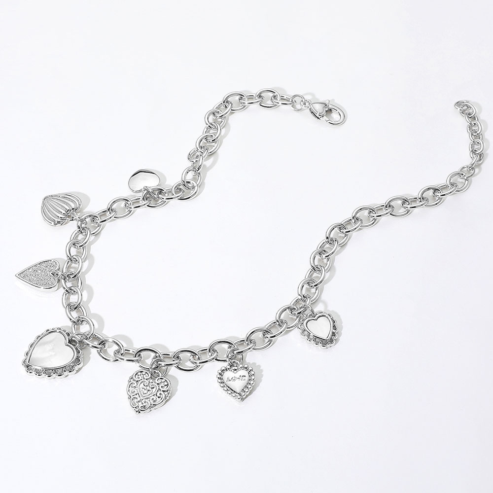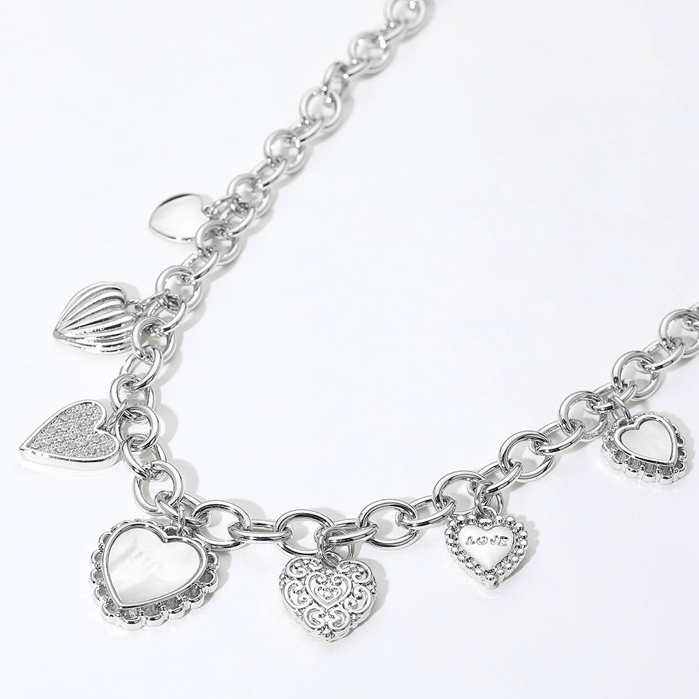 Details • Necklace Size : 18" + 2" L • Decor Size : 1.3" L • Stylish chain necklace featuring a variety of heart-shaped charms with unique textures and finishes. A romantic accessory that adds personality and charm to any outfit, perfect for gifting or everyday wear. • Gold Dipped • CZ Cubic Zirconia