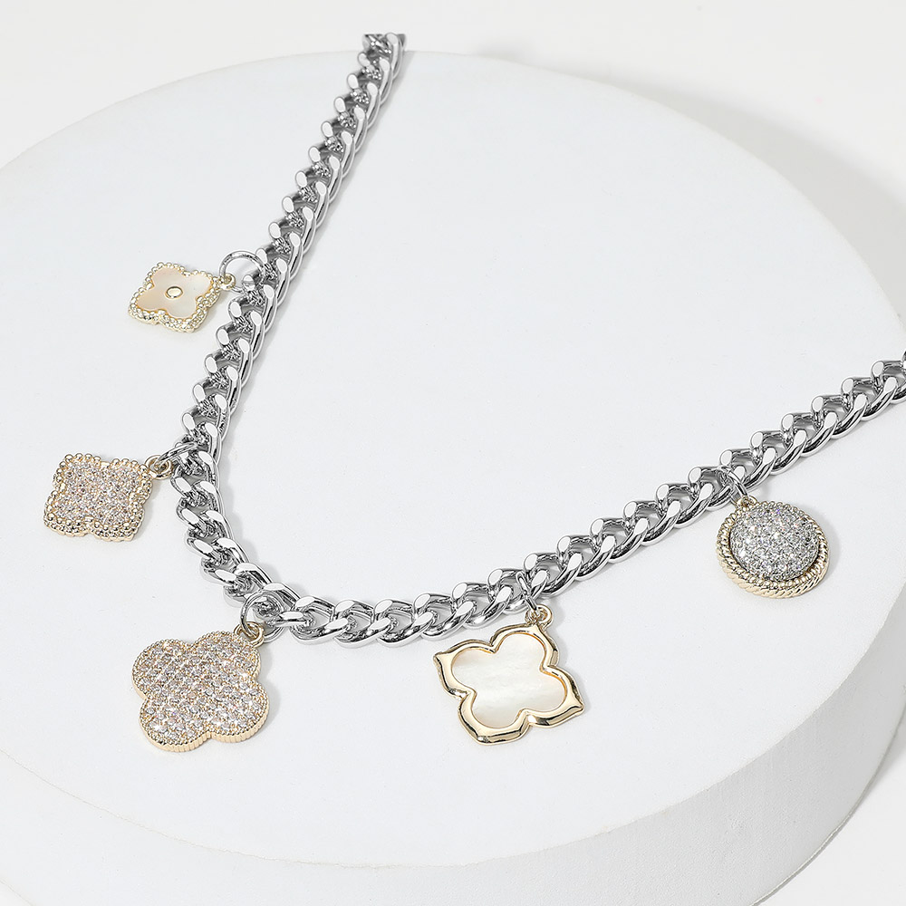 14K Gold Plated CZ Stone Paved Mother of Pearl Quatrefoil Charm Station Necklace