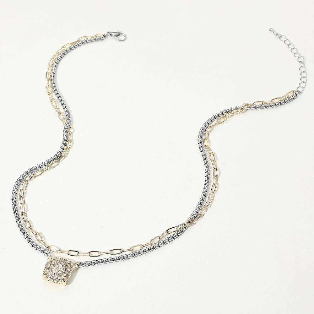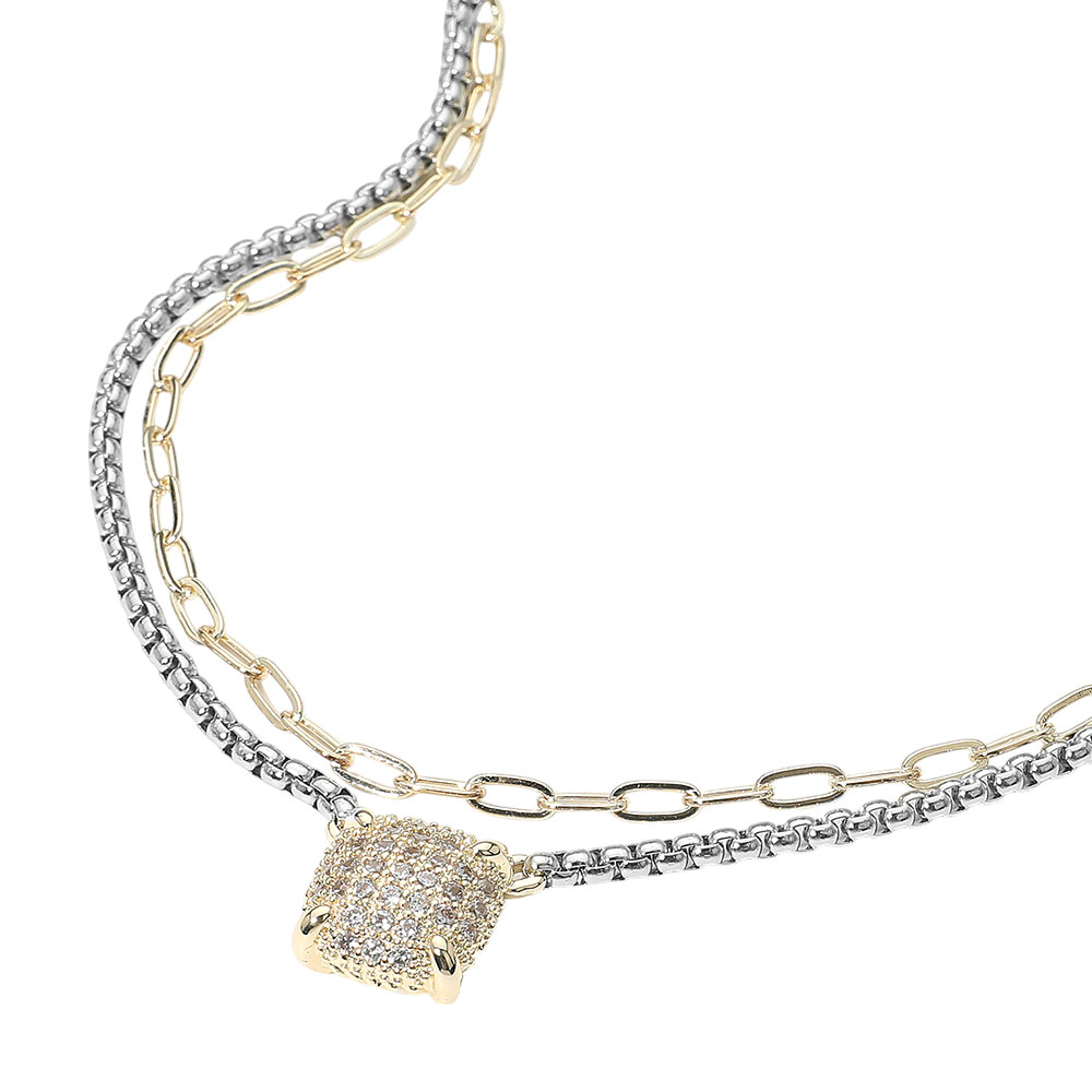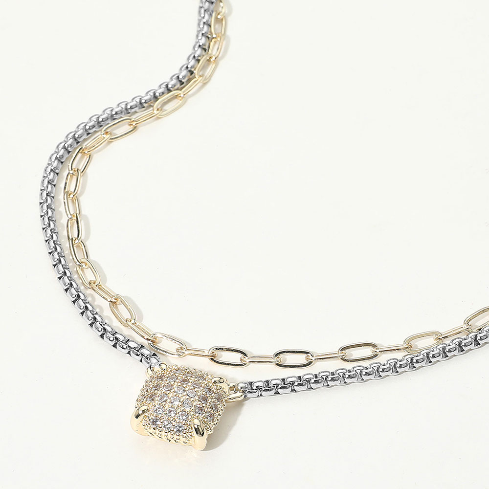 14K Gold Plated CZ Stone Paved Pendant Accent Two Tone Layered Chain Necklace